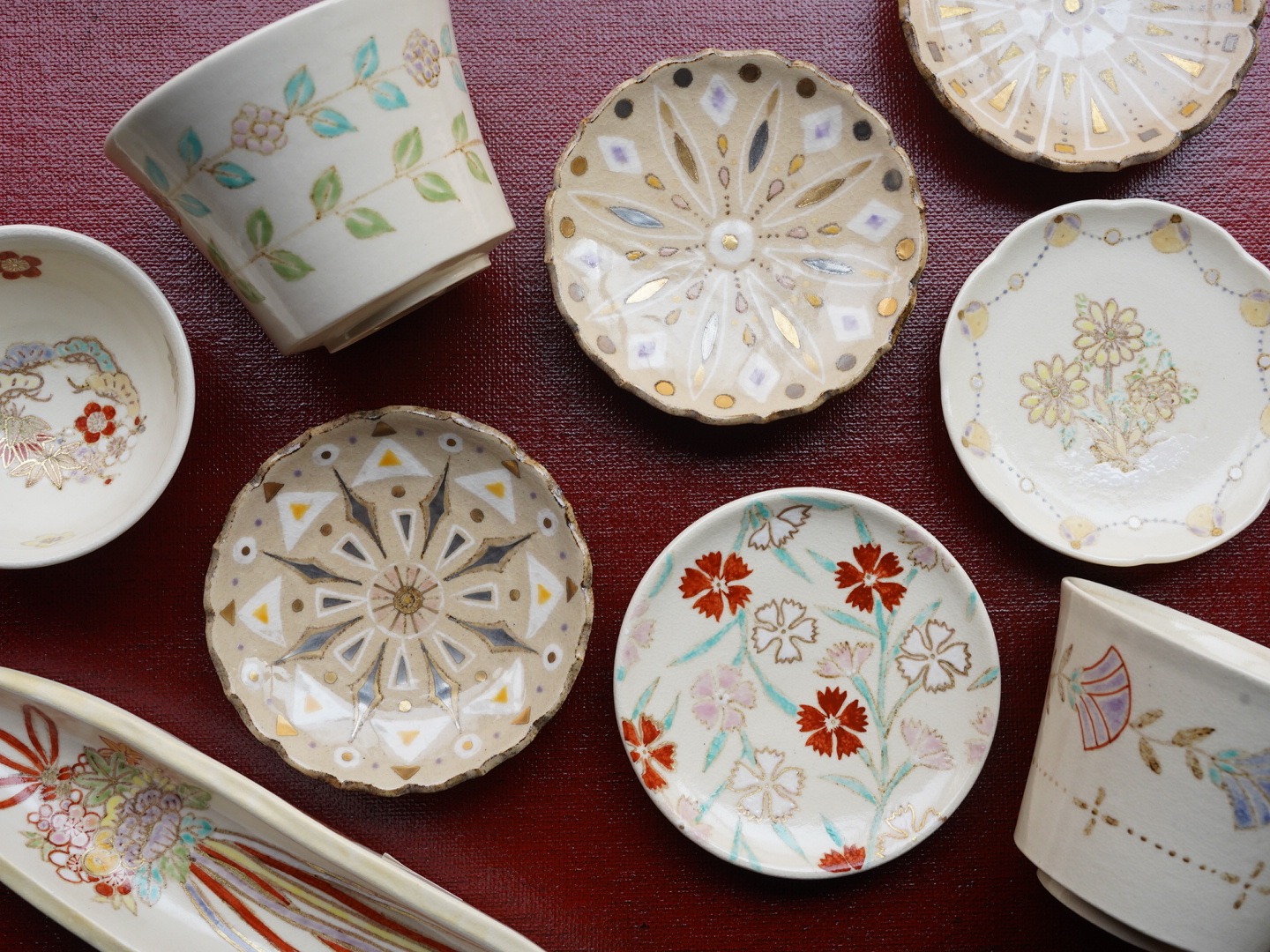 上品で可憐な友田さんの作品は上絵付けの技法をメインに、象嵌(土台のベージュ地を彫って白い泥を埋めこん削り出す)技法や螺鈿細工の作品など様々。