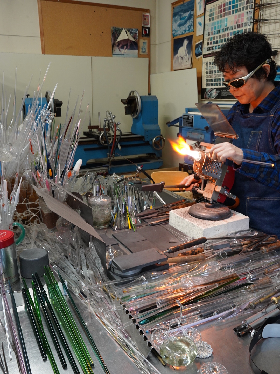 酸素バーナーワークというガラス表現技法で、ガラス管を使い、水や水辺に住む生き物を題材とした作品をメインに制作されています。