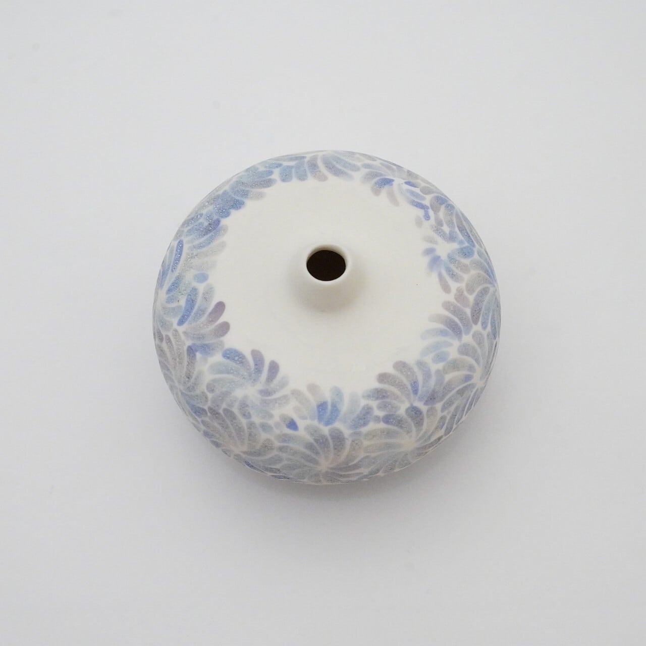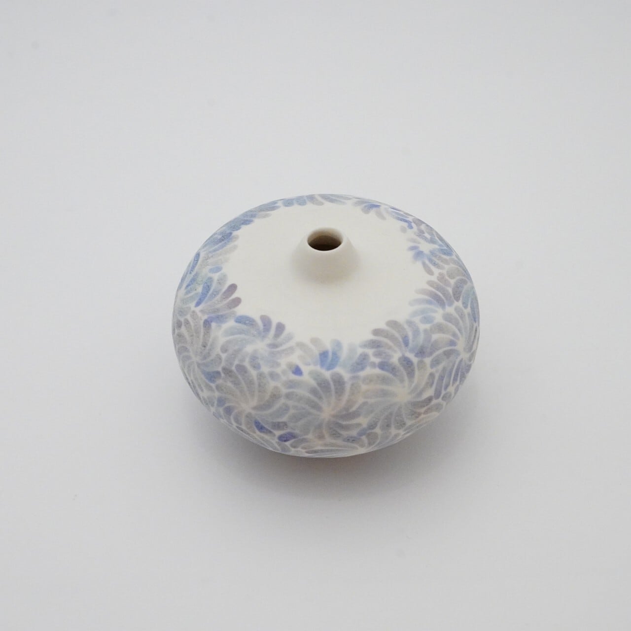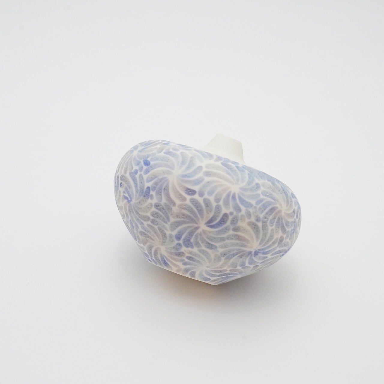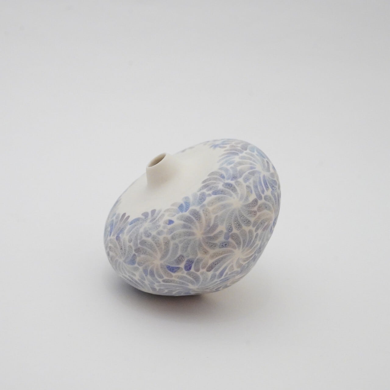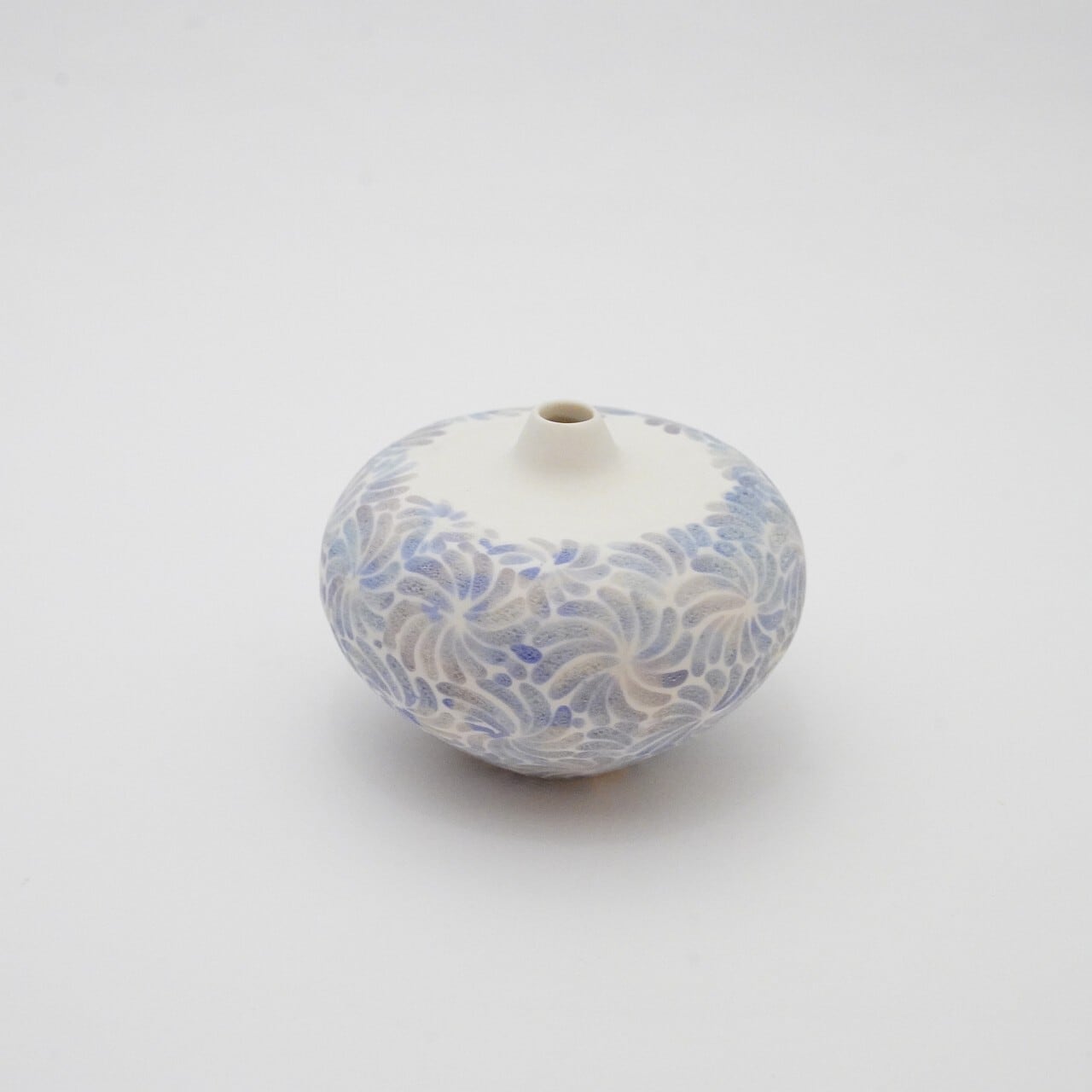 轆轤や石膏型(花器などは石膏型)で成形した生地に、削りの模様を入れ、素焼きし、その後パステルの色を付け、細かい泡が発生する釉薬を掛け焼いていきます。