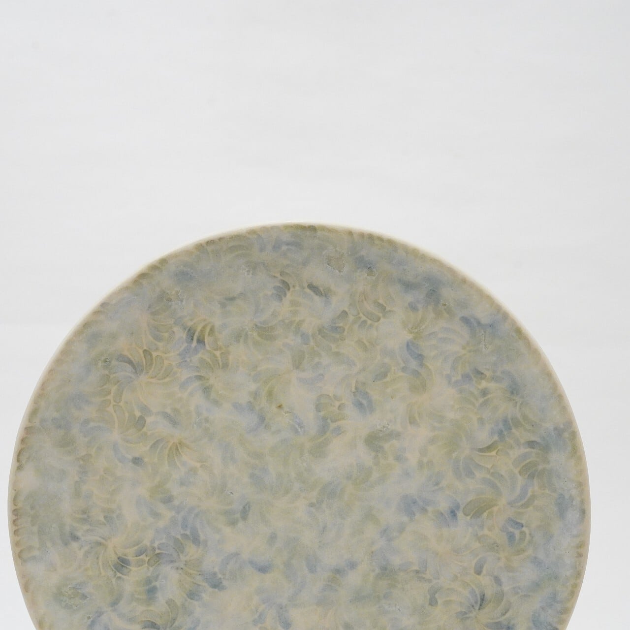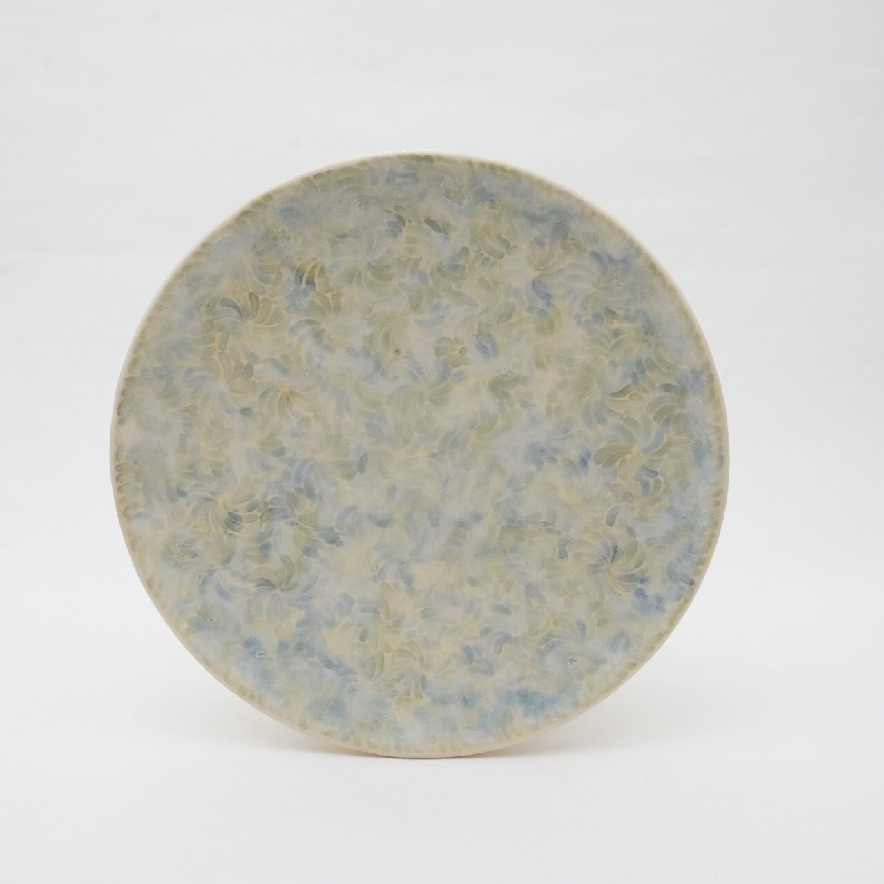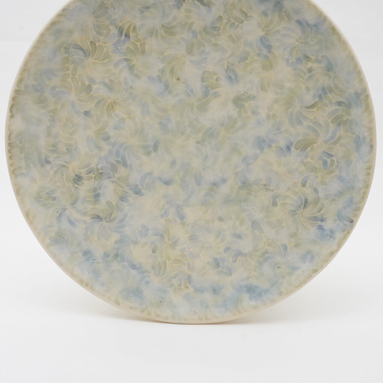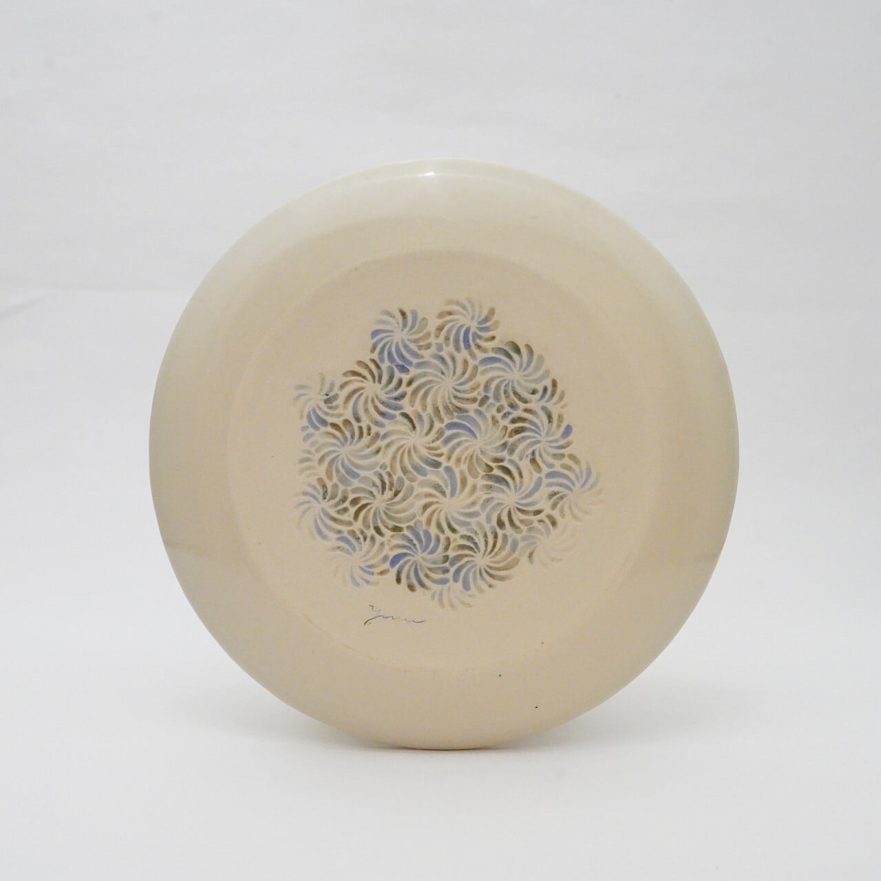 轆轤や石膏型(花器などは石膏型)で成形した生地に、削りの模様を入れ、素焼きし、その後パステルの色を付け、細かい泡が発生する釉薬を掛け焼いていきます。