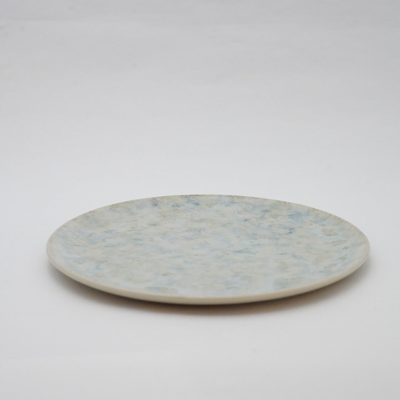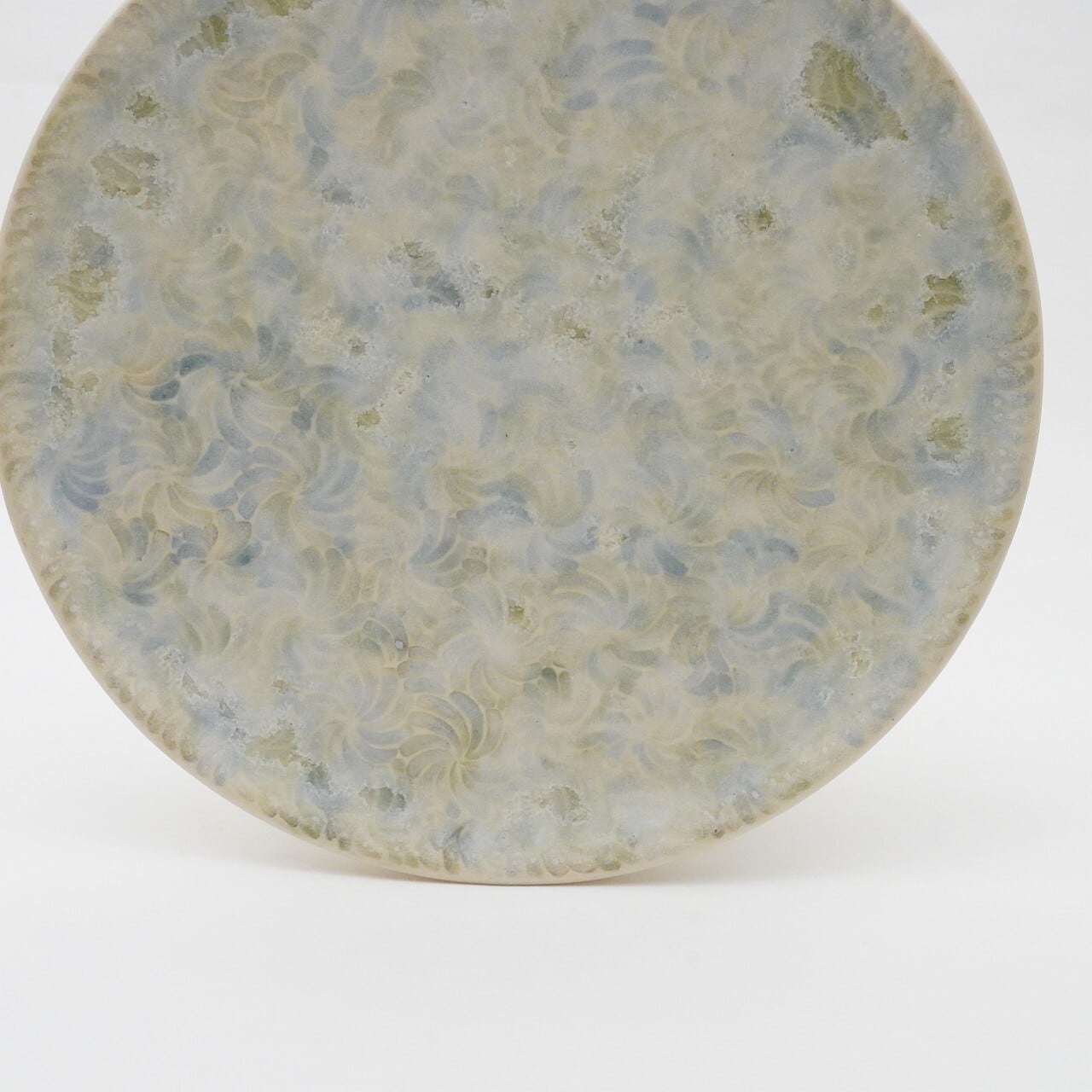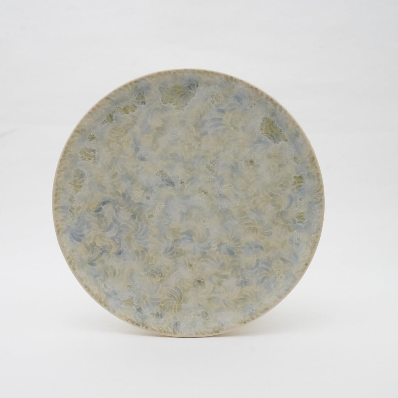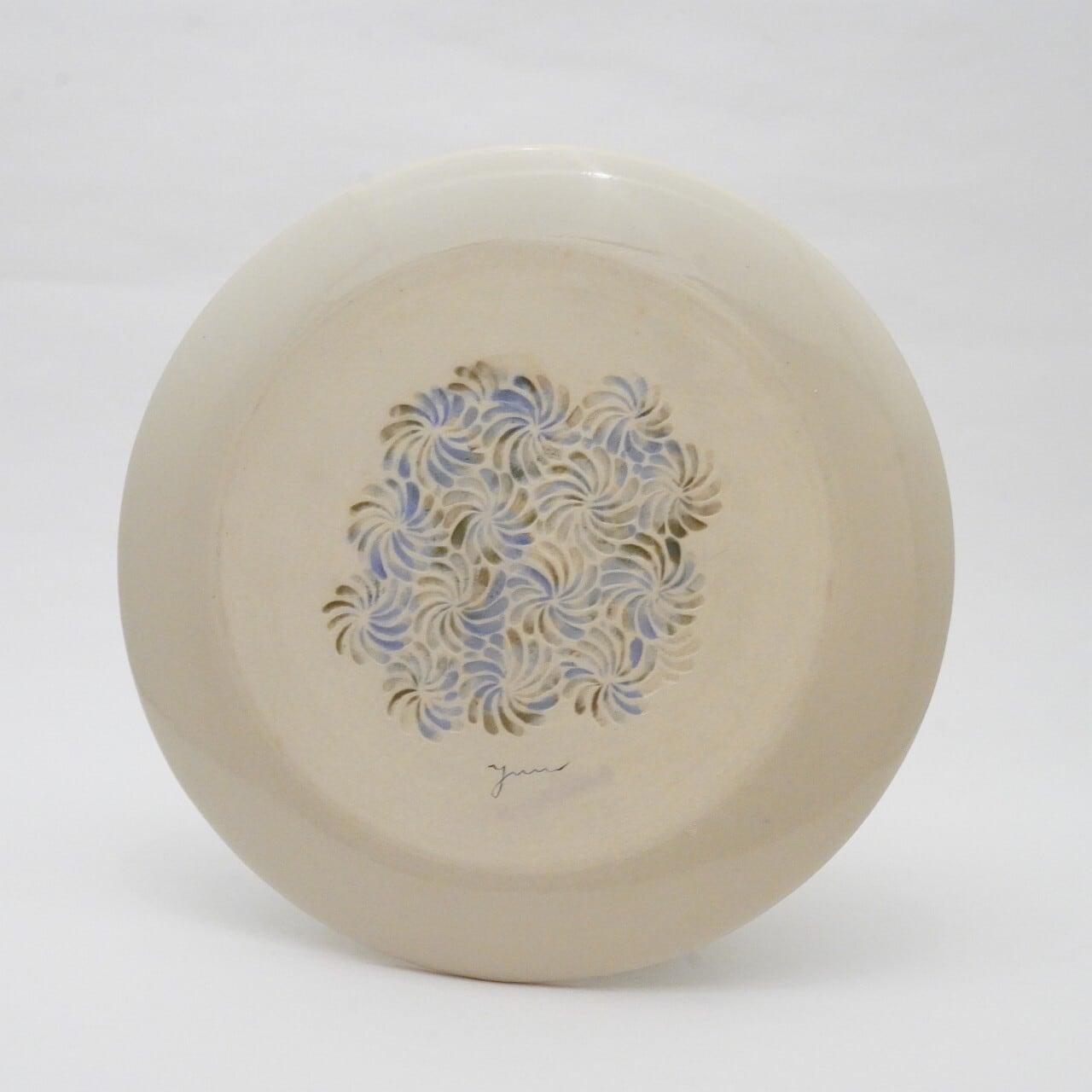 轆轤や石膏型(花器などは石膏型)で成形した生地に、削りの模様を入れ、素焼きし、その後パステルの色を付け、細かい泡が発生する釉薬を掛け焼いていきます。