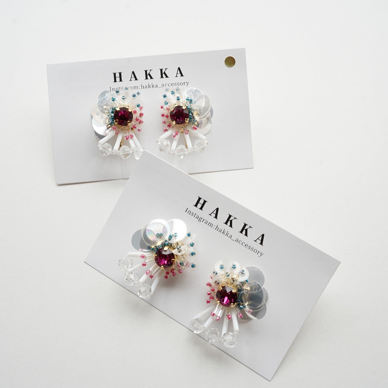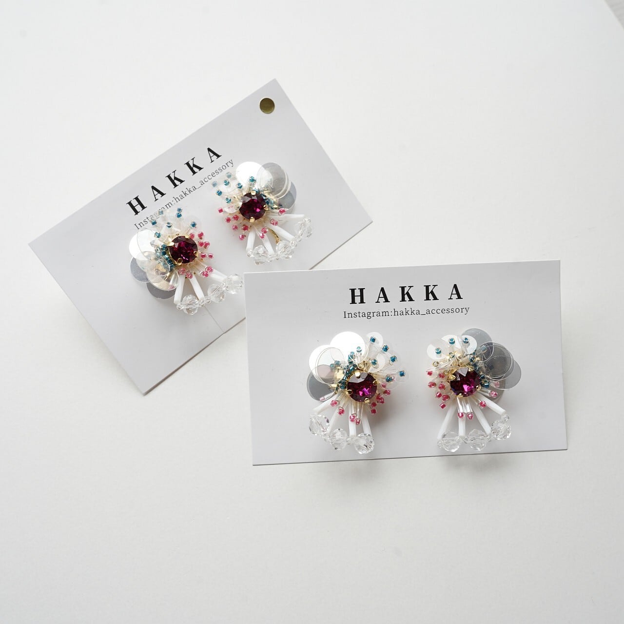 キラキラのスワロフスキーと、スパンコールを使用しており透明感で軽やかさを表現しています。