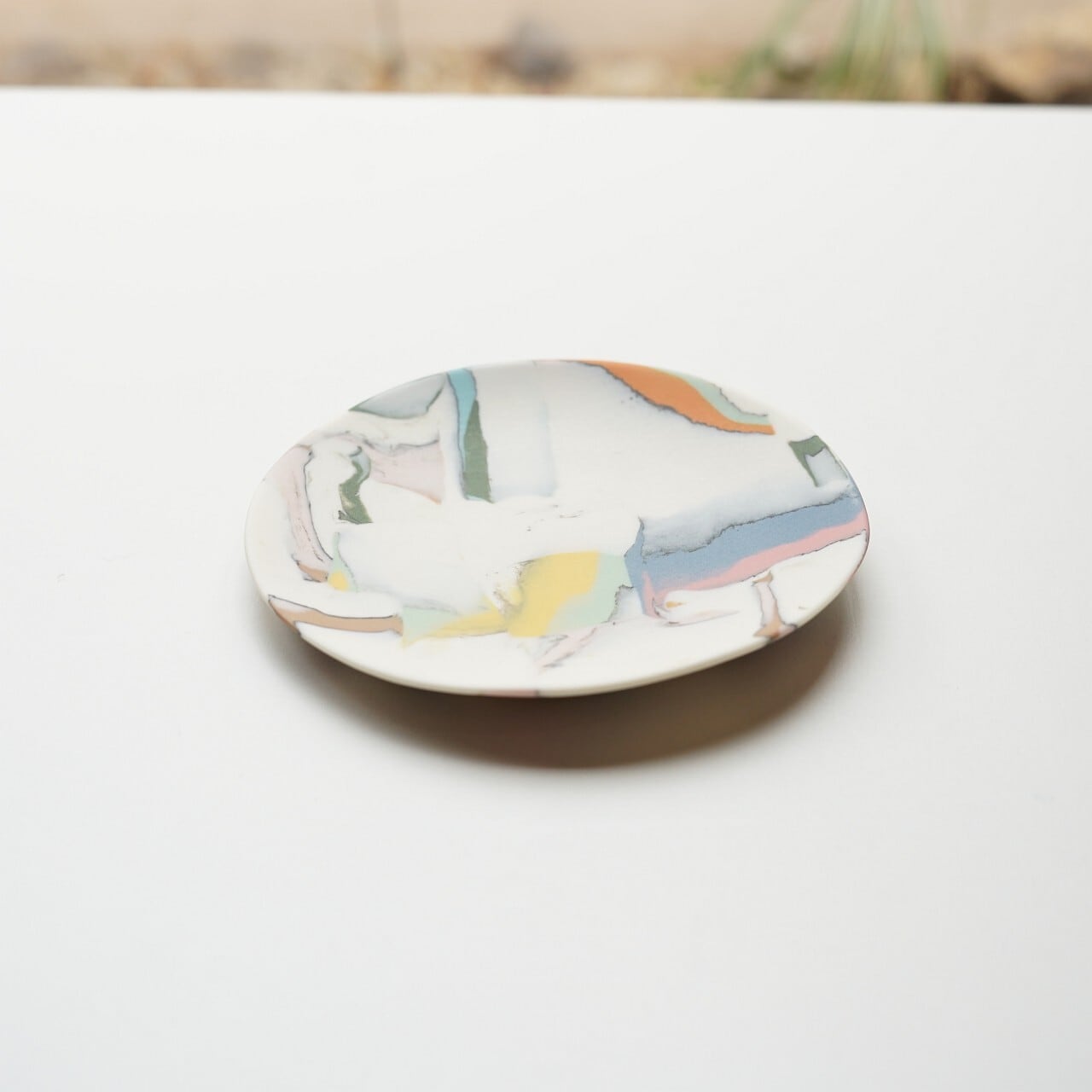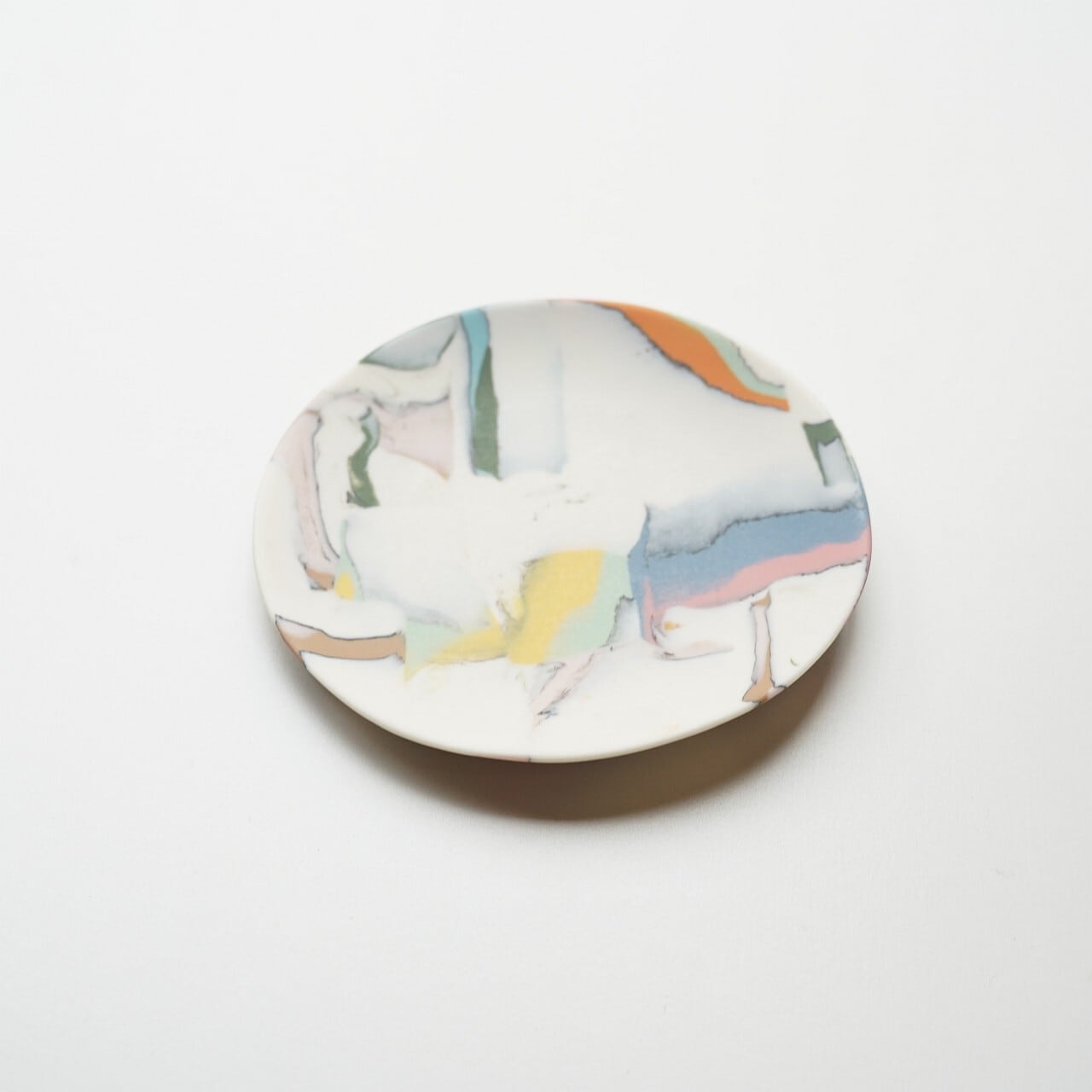 違う色の磁器土を混ぜ合わせ、貼り合わせたり、削ったりして偶然出会う模様、色の組み合わせを楽しみながら制作されています。