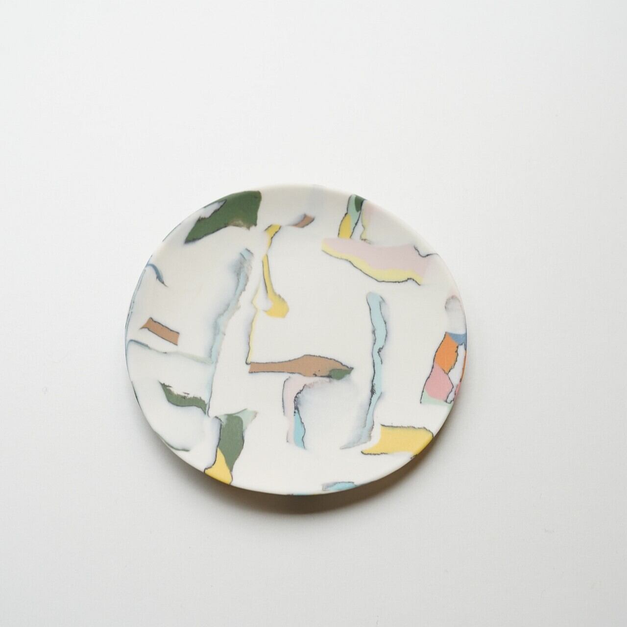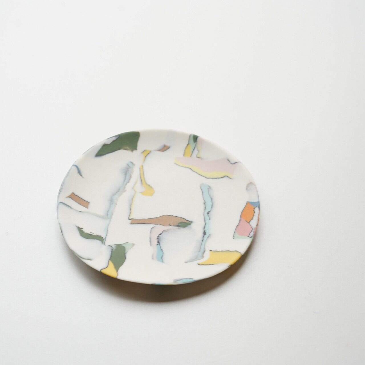 違う色の磁器土を混ぜ合わせ、貼り合わせたり、削ったりして偶然出会う模様、色の組み合わせを楽しみながら制作されています。