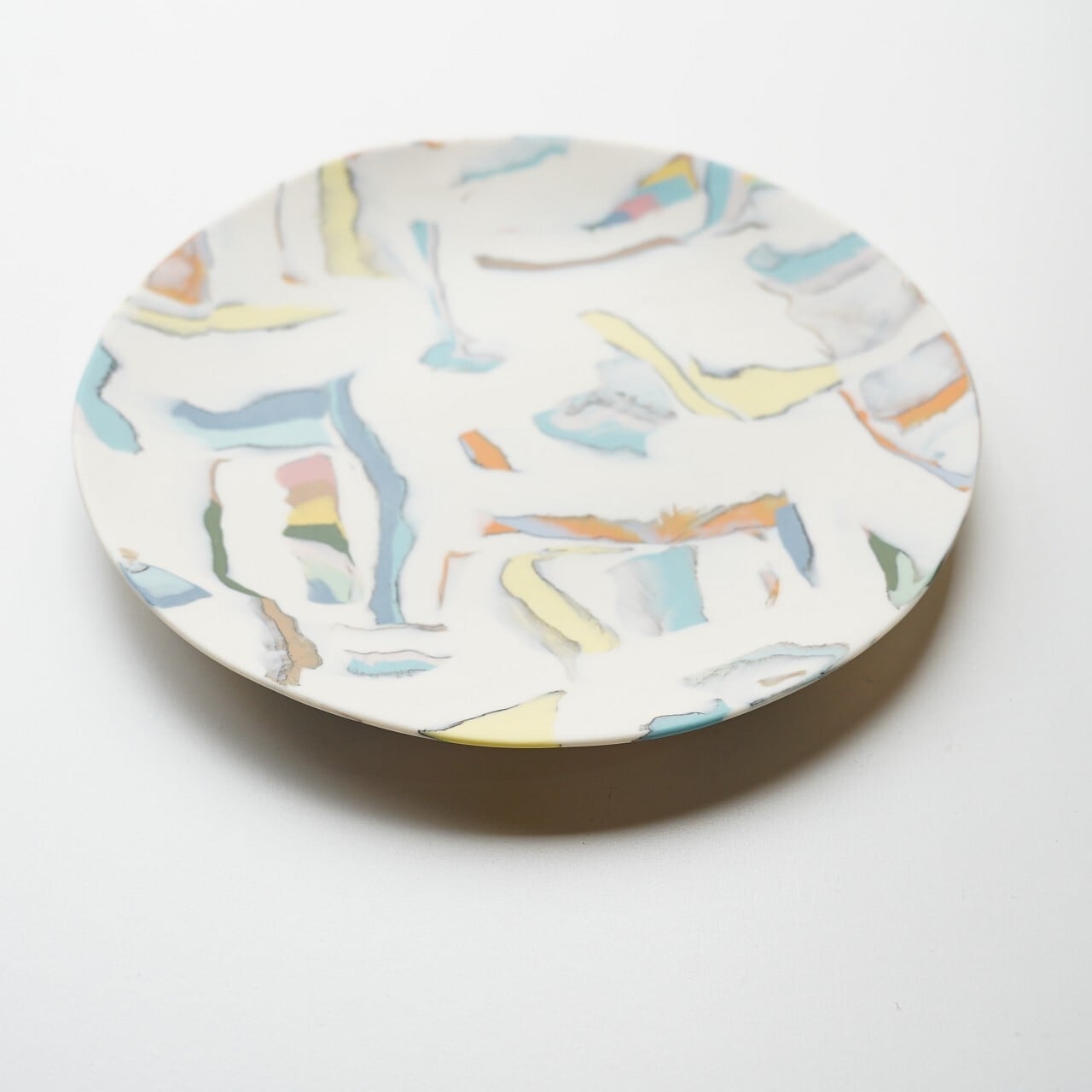 違う色の磁器土を混ぜ合わせ、貼り合わせたり、削ったりして偶然出会う模様、色の組み合わせを楽しみながら制作されています。