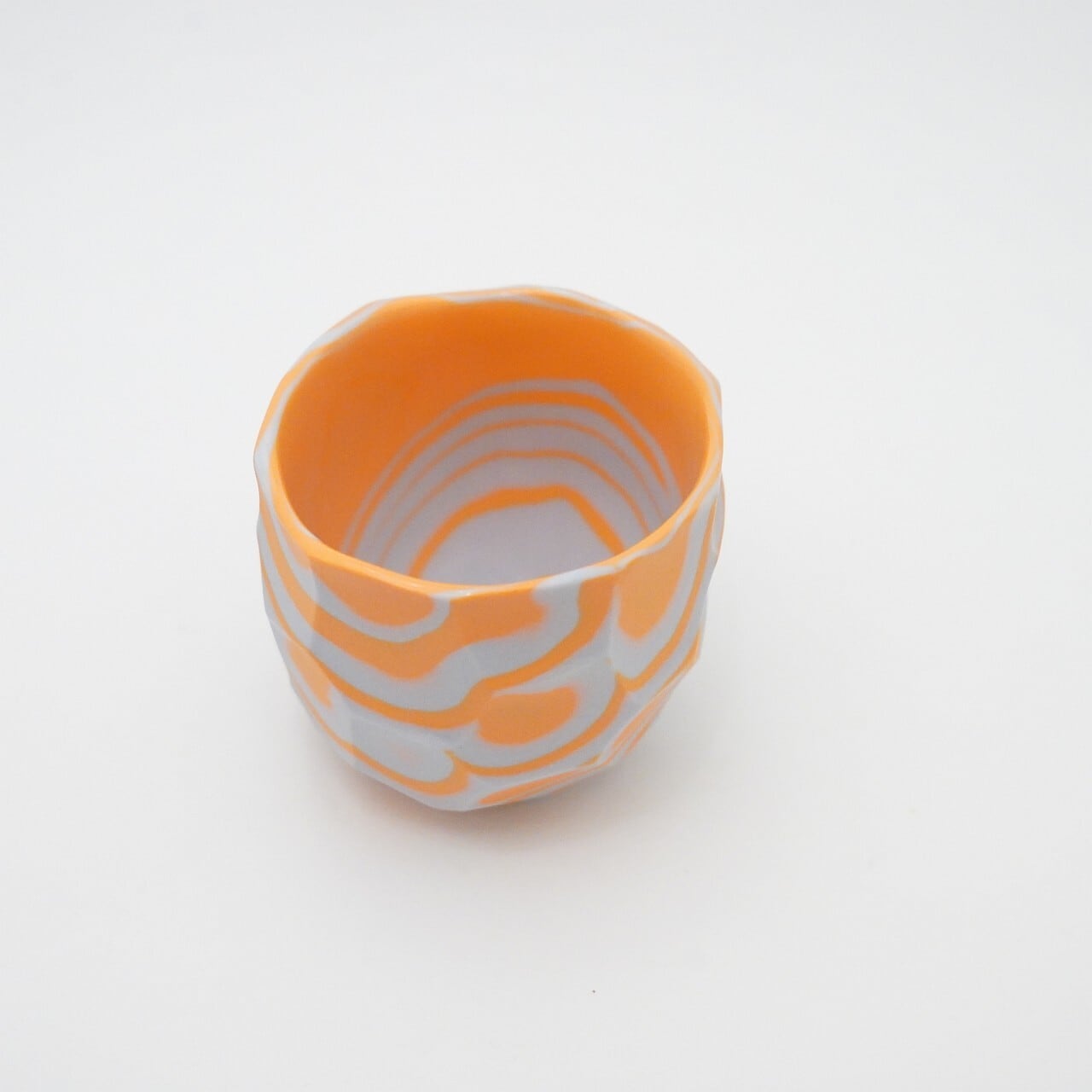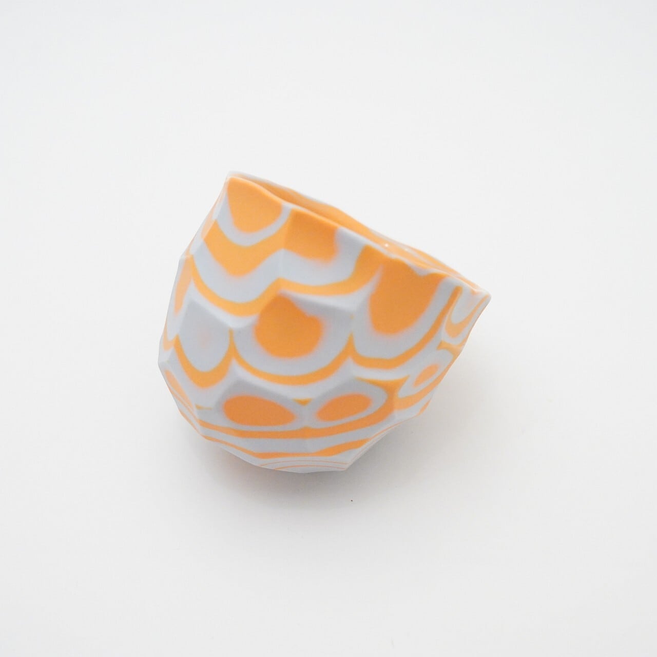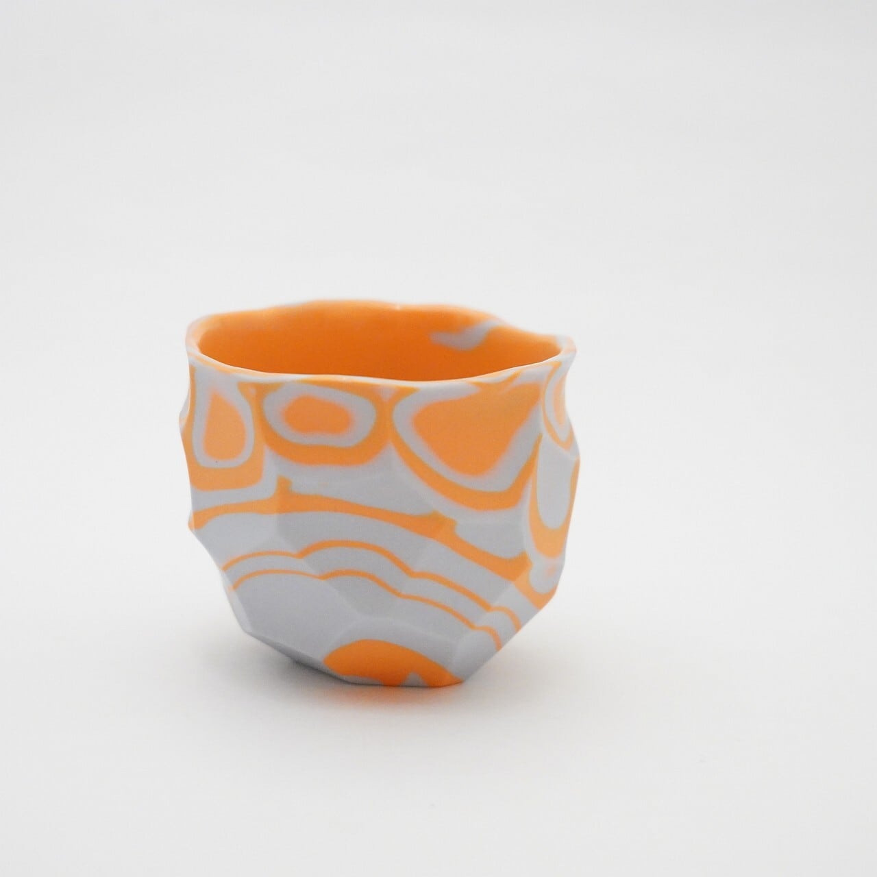 違う色の磁器土を混ぜ合わせ、貼り合わせたり、削ったりして偶然出会う模様、色の組み合わせを楽しみながら制作されています。