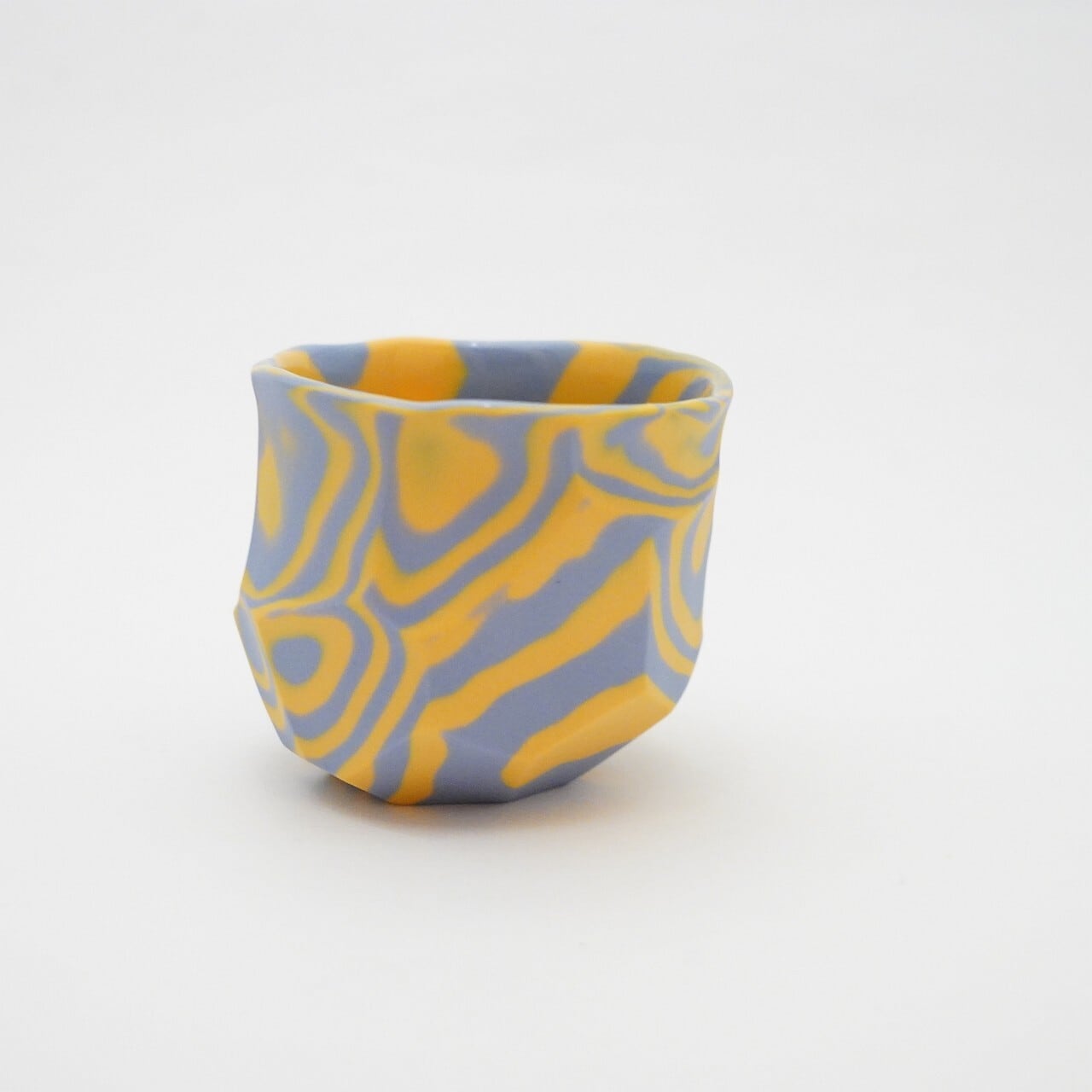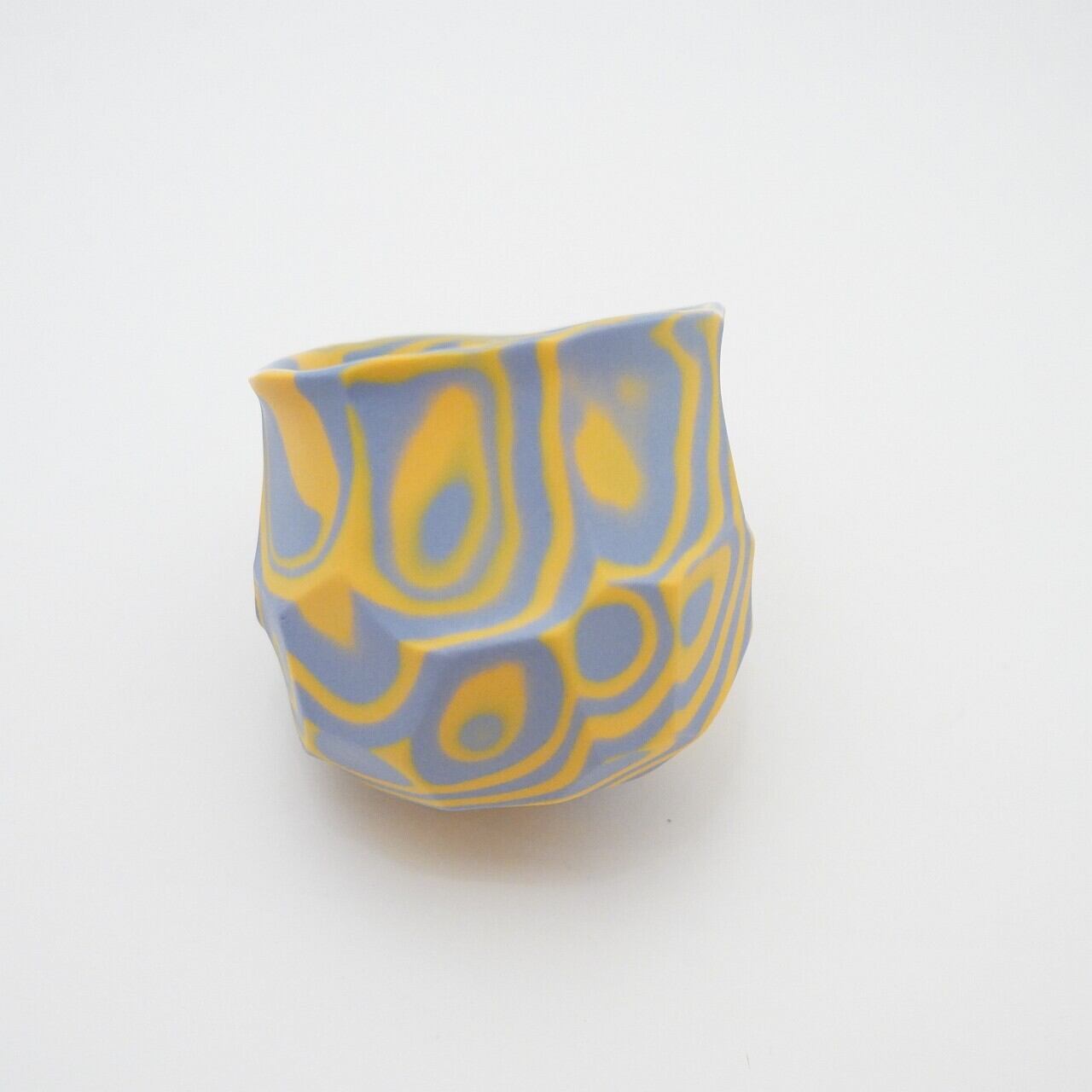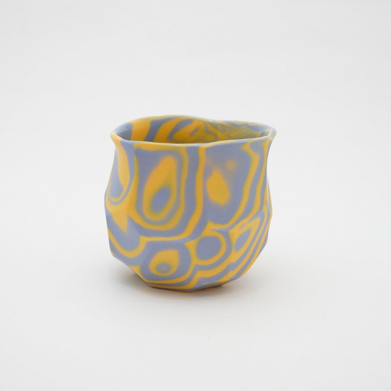違う色の磁器土を混ぜ合わせ、貼り合わせたり、削ったりして偶然出会う模様、色の組み合わせを楽しみながら制作されています。