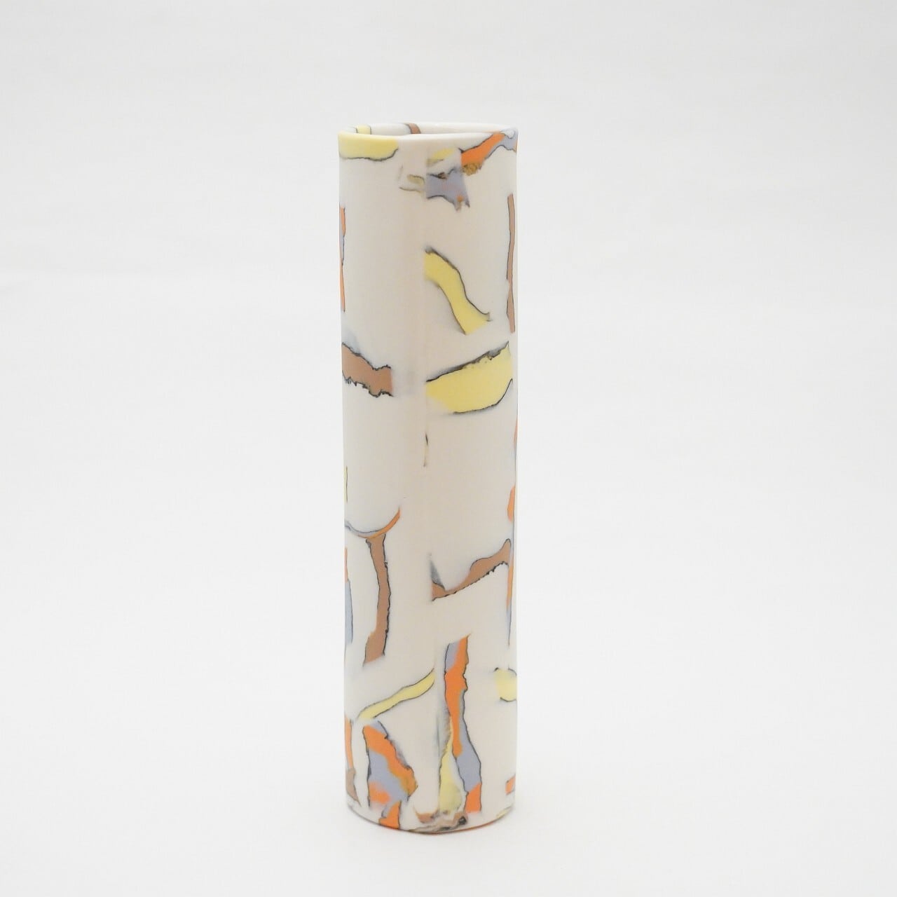 違う色の磁器土を混ぜ合わせ、貼り合わせたり、削ったりして偶然出会う模様、色の組み合わせを楽しみながら制作されています。