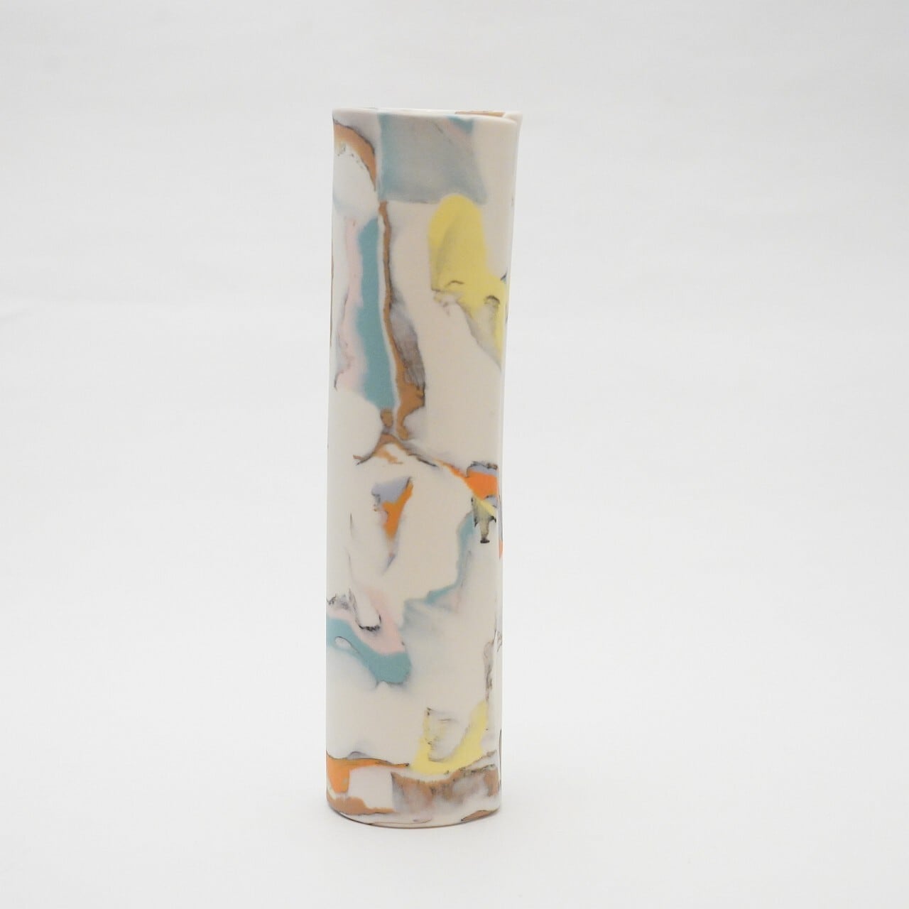 違う色の磁器土を混ぜ合わせ、貼り合わせたり、削ったりして偶然出会う模様、色の組み合わせを楽しみながら制作されています。