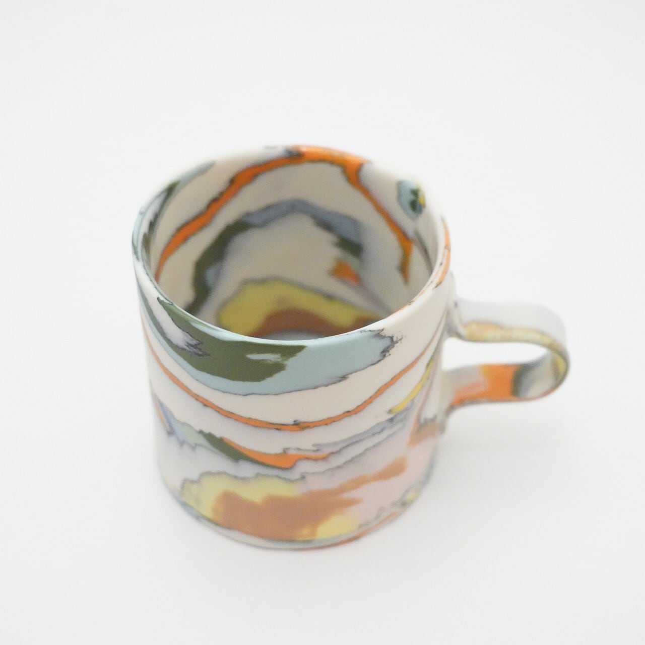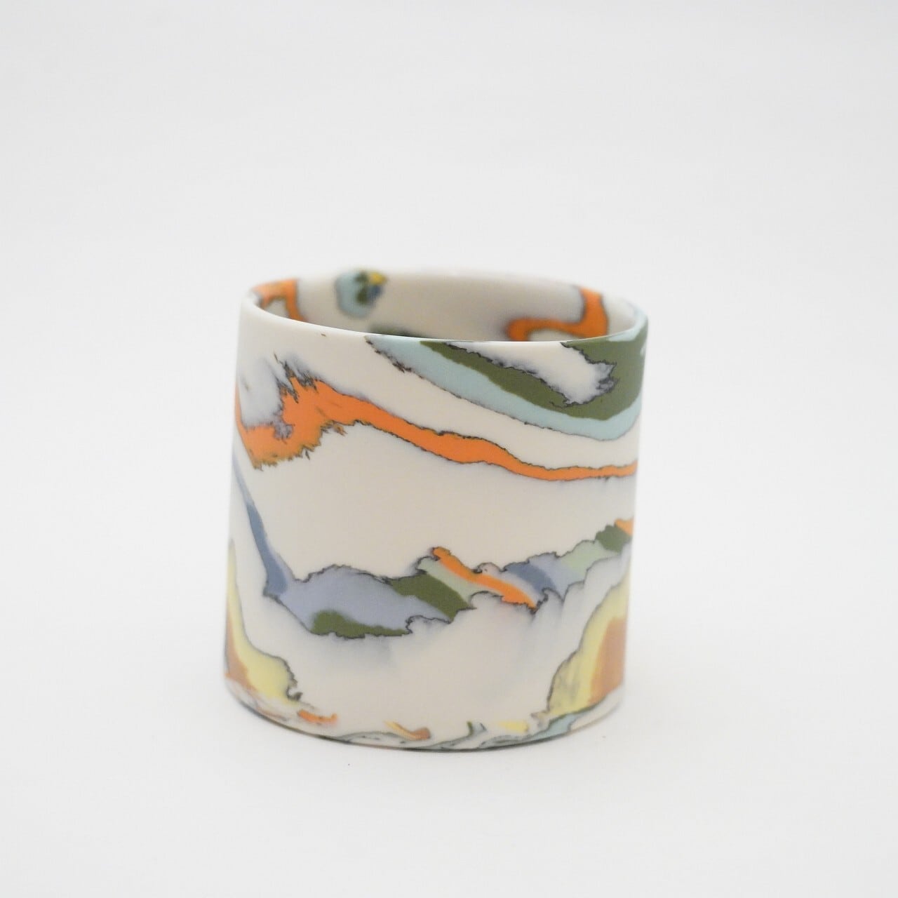 違う色の磁器土を混ぜ合わせ、貼り合わせたり、削ったりして偶然出会う模様、色の組み合わせを楽しみながら制作されています。