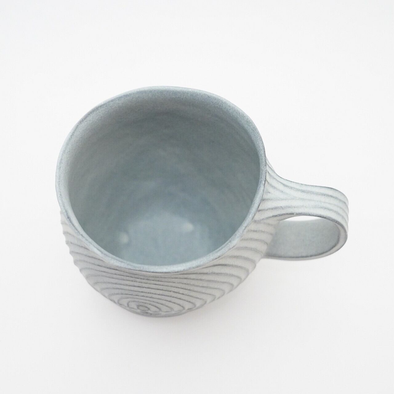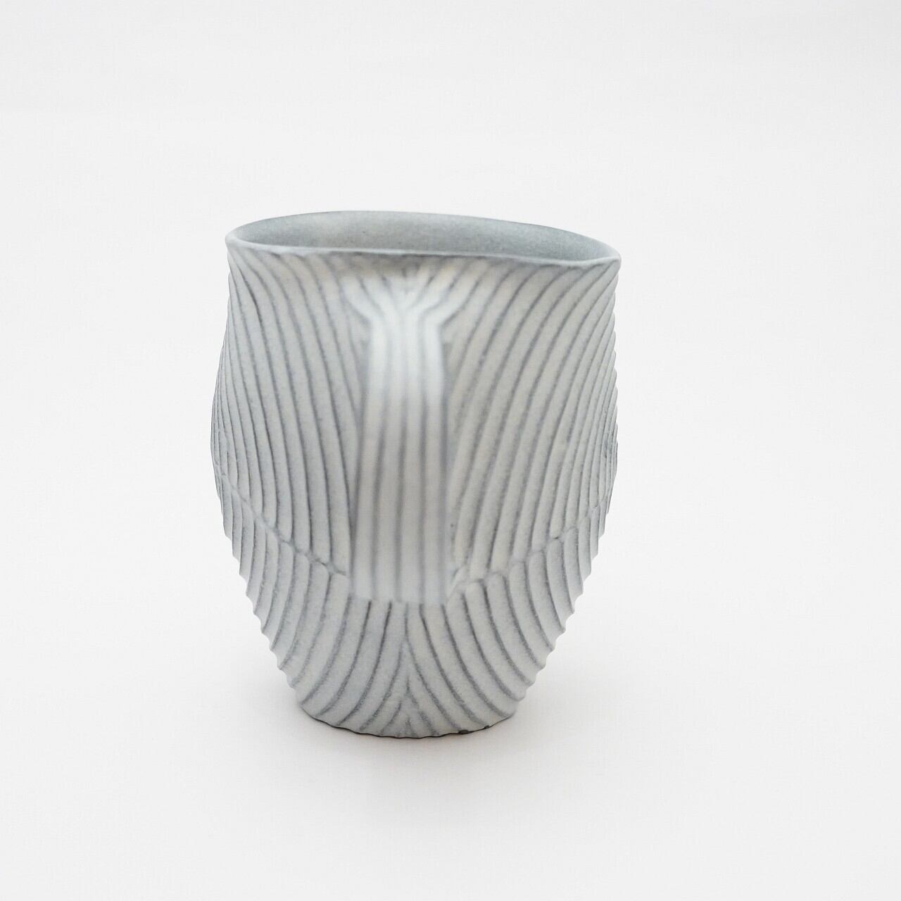 黒い陶土と白い釉薬の濃淡による独特の色合いが特徴のしのぎ技法を得意とする。