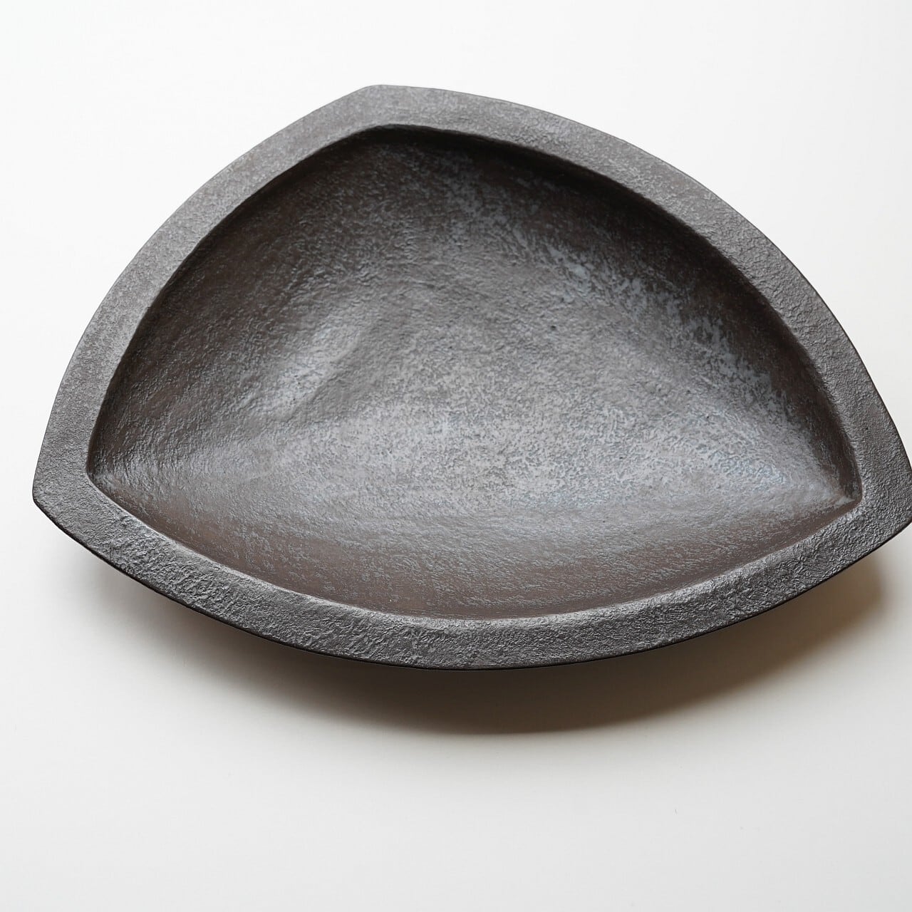 黒い陶土と白い釉薬の濃淡による独特の色合いが特徴のしのぎ技法を得意とする。