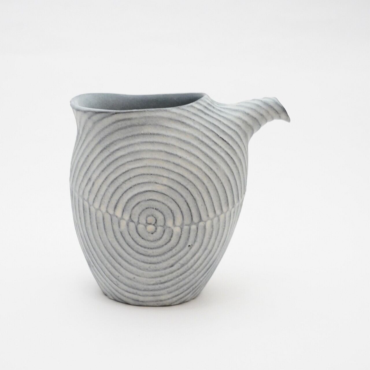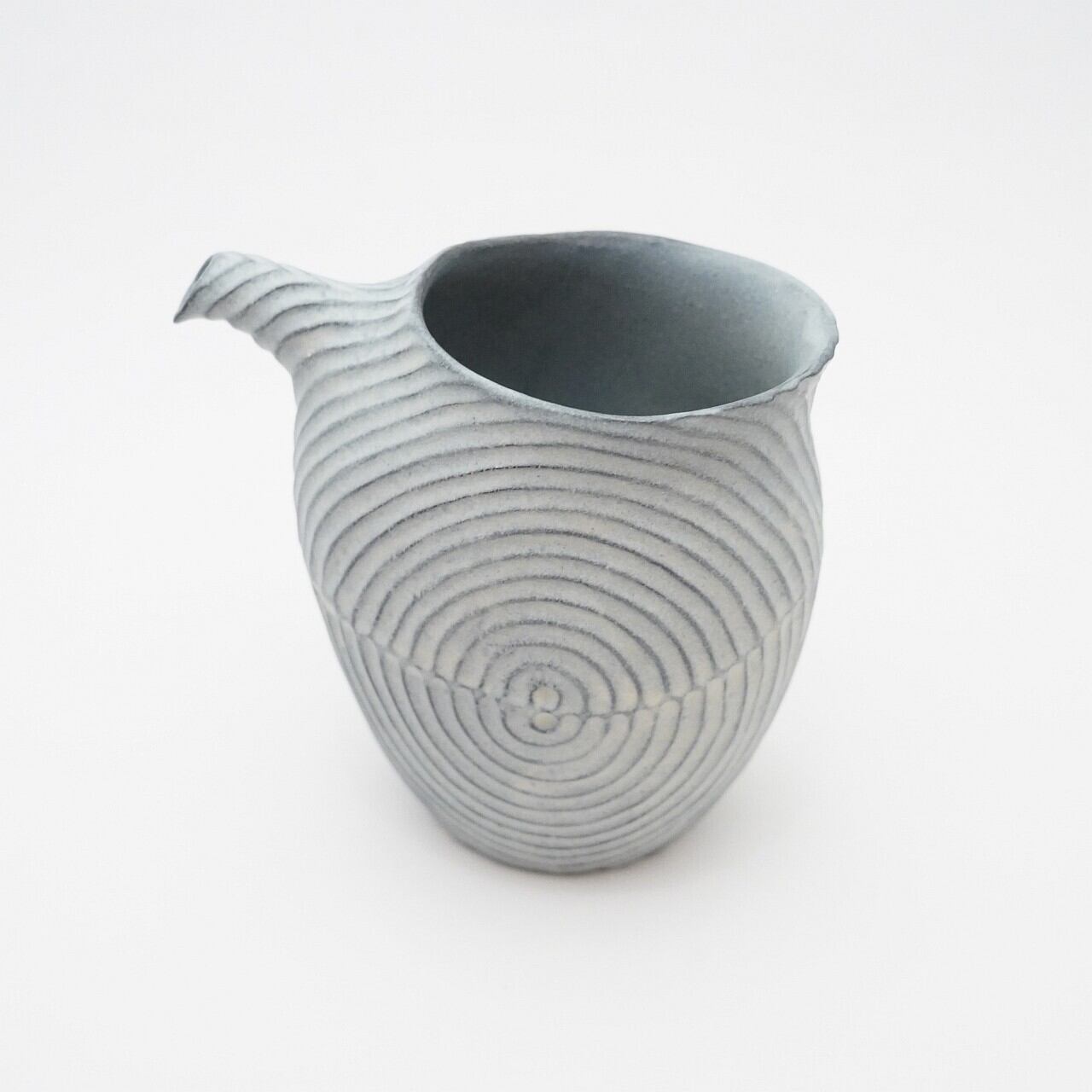 黒い陶土と白い釉薬の濃淡による独特の色合いが特徴のしのぎ技法を得意とする。