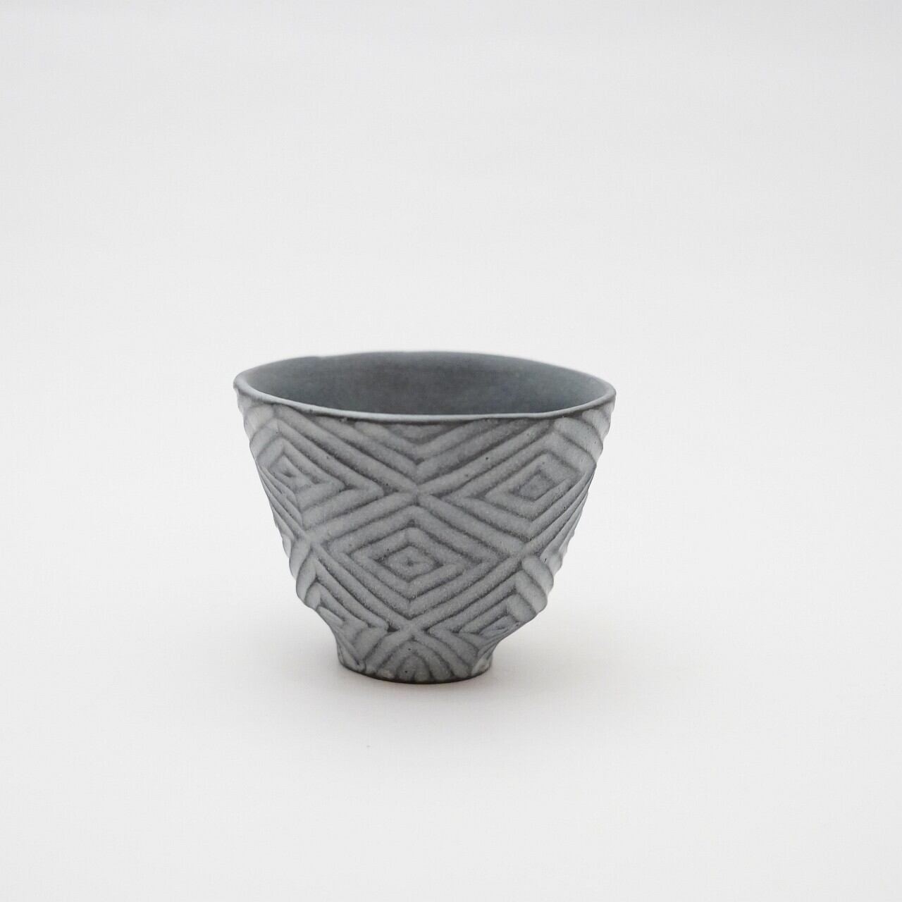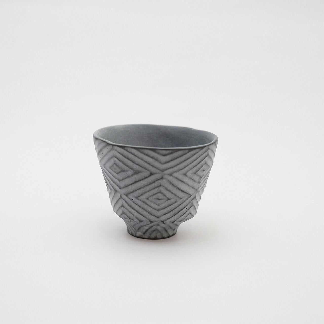 黒い陶土と白い釉薬の濃淡による独特の色合いが特徴のしのぎ技法を得意とする。