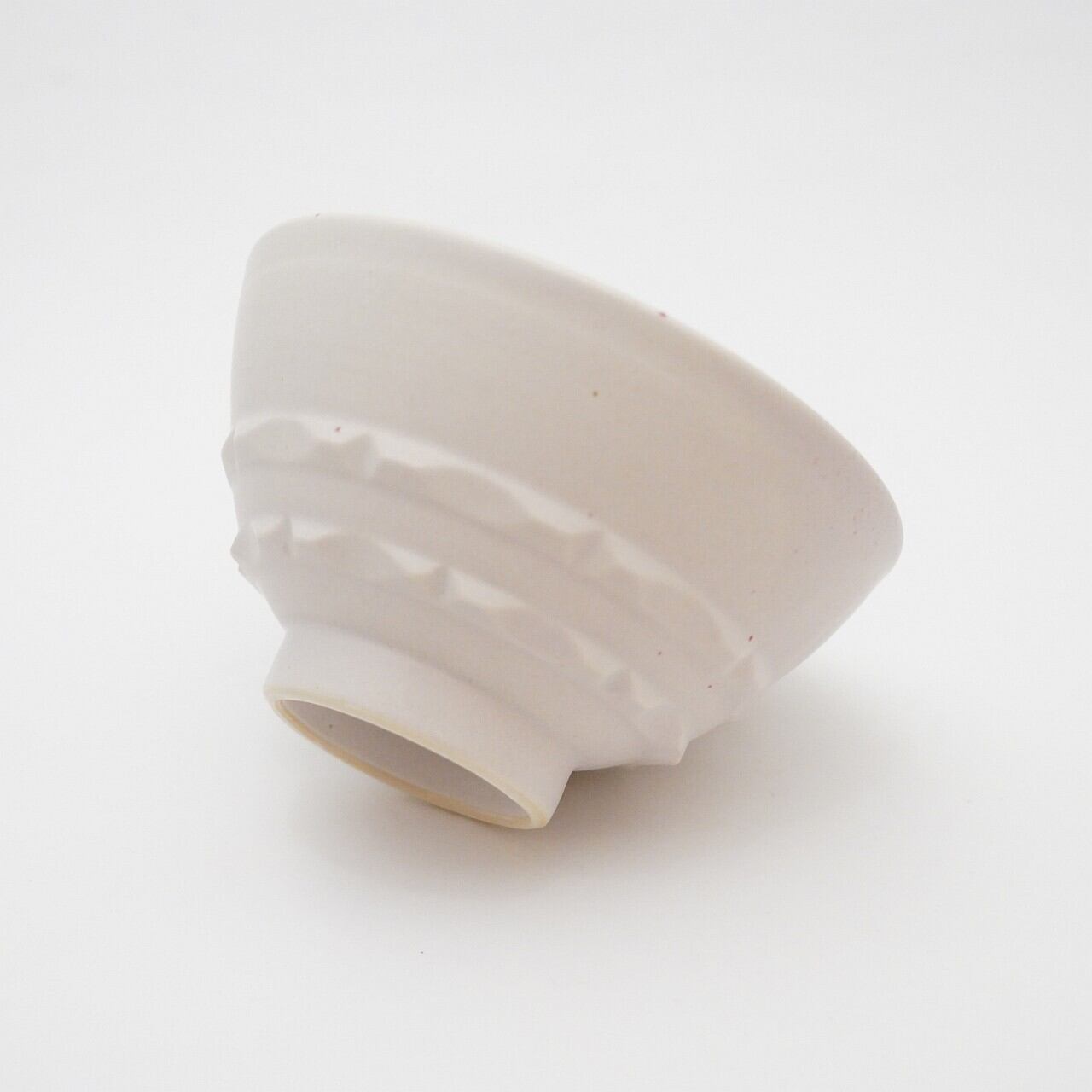 黒い陶土と白い釉薬の濃淡による独特の色合いが特徴のしのぎ技法を得意とする。