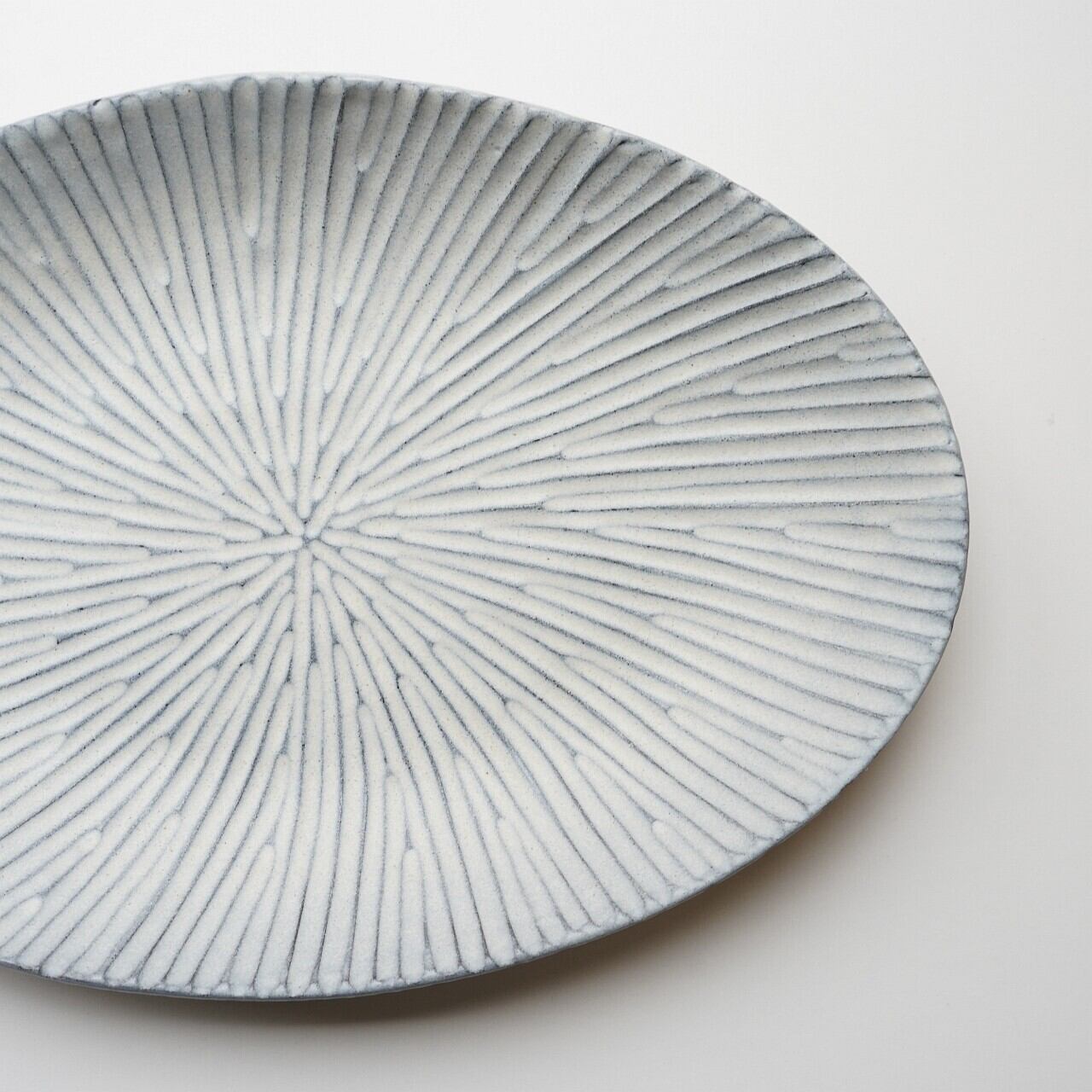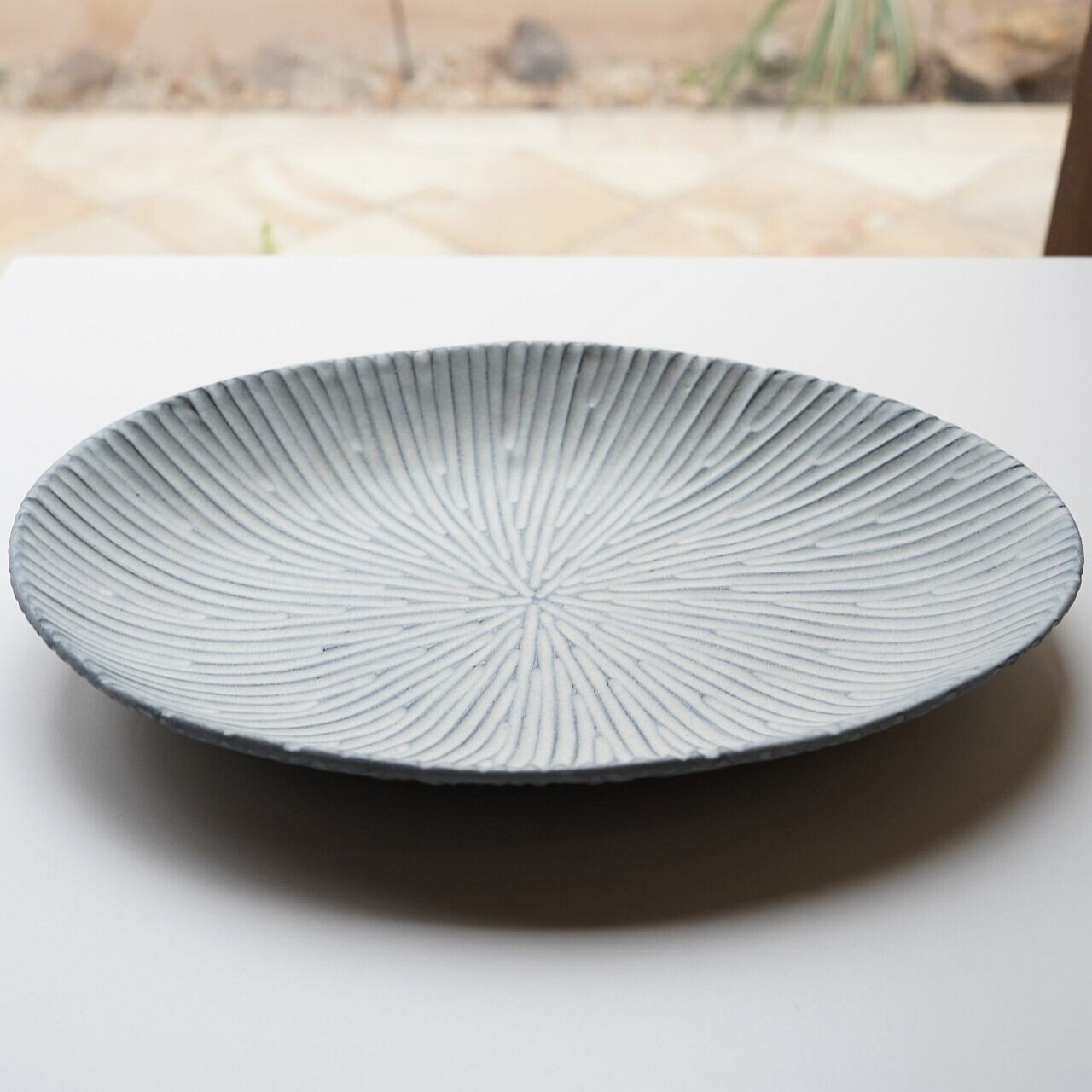 黒い陶土と白い釉薬の濃淡による独特の色合いが特徴のしのぎ技法を得意とする。
