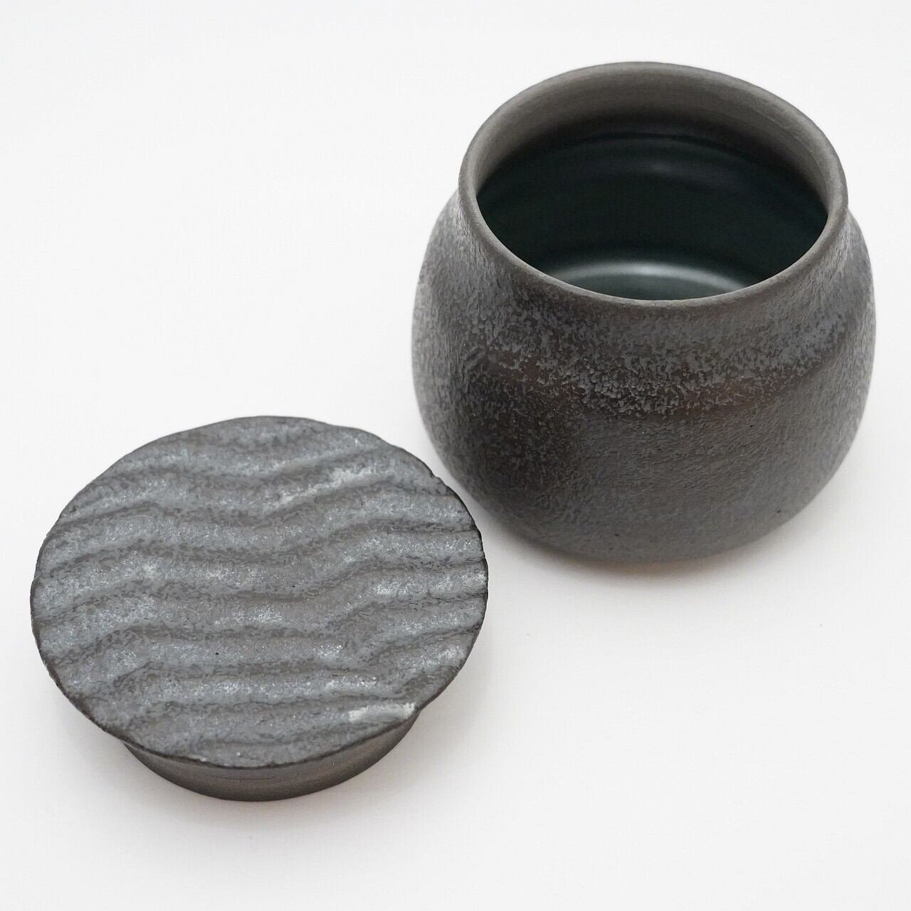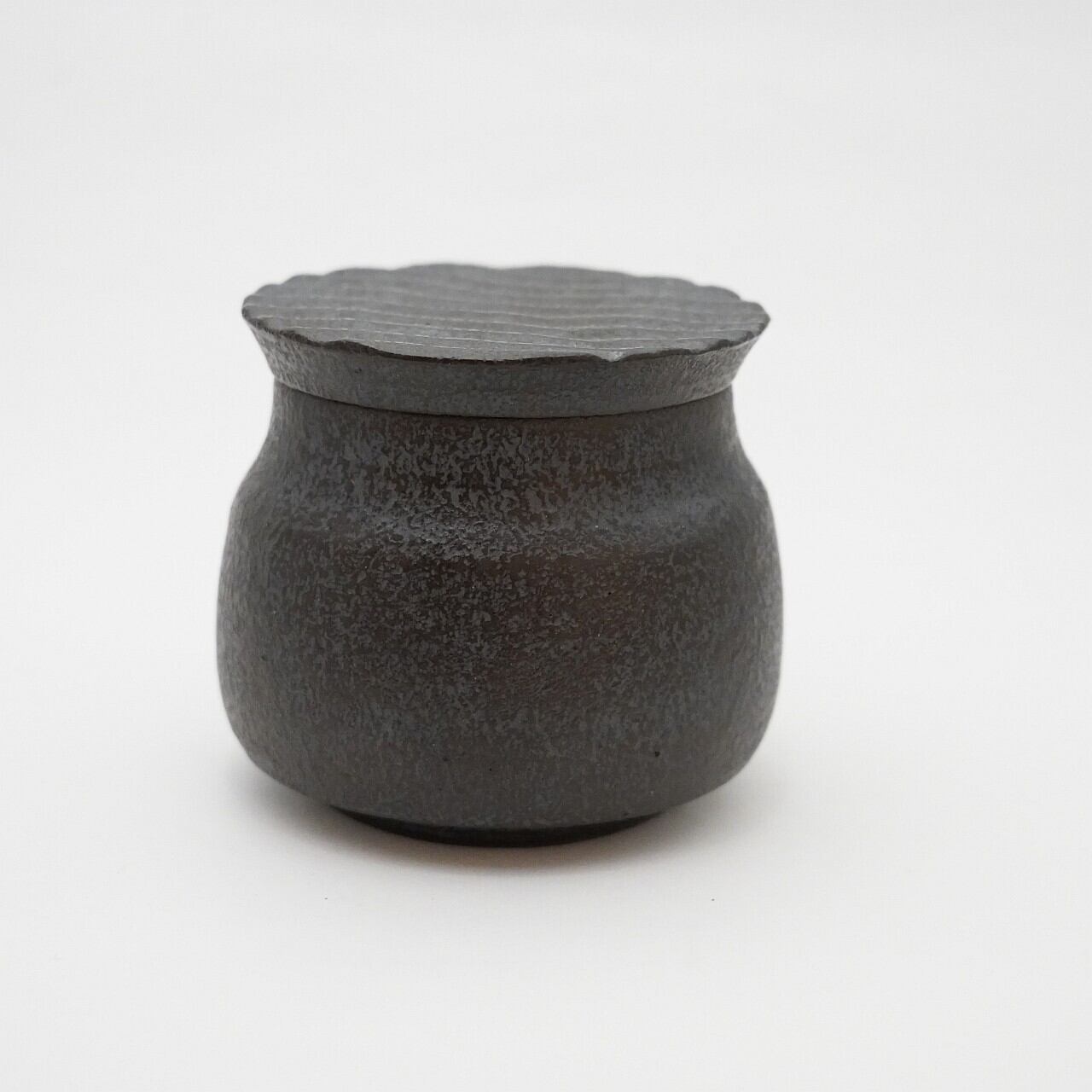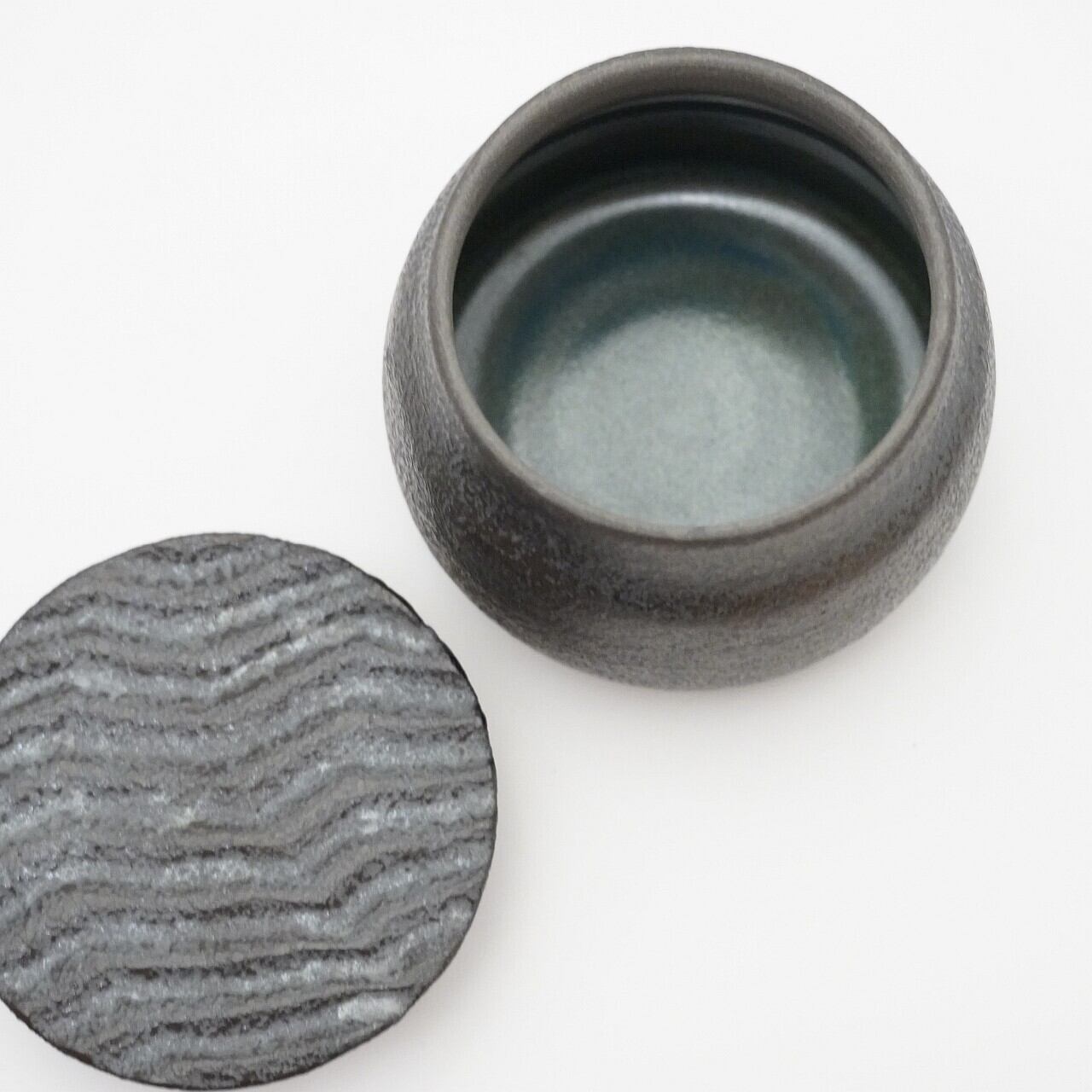 黒い陶土と白い釉薬の濃淡による独特の色合いが特徴のしのぎ技法を得意とする。