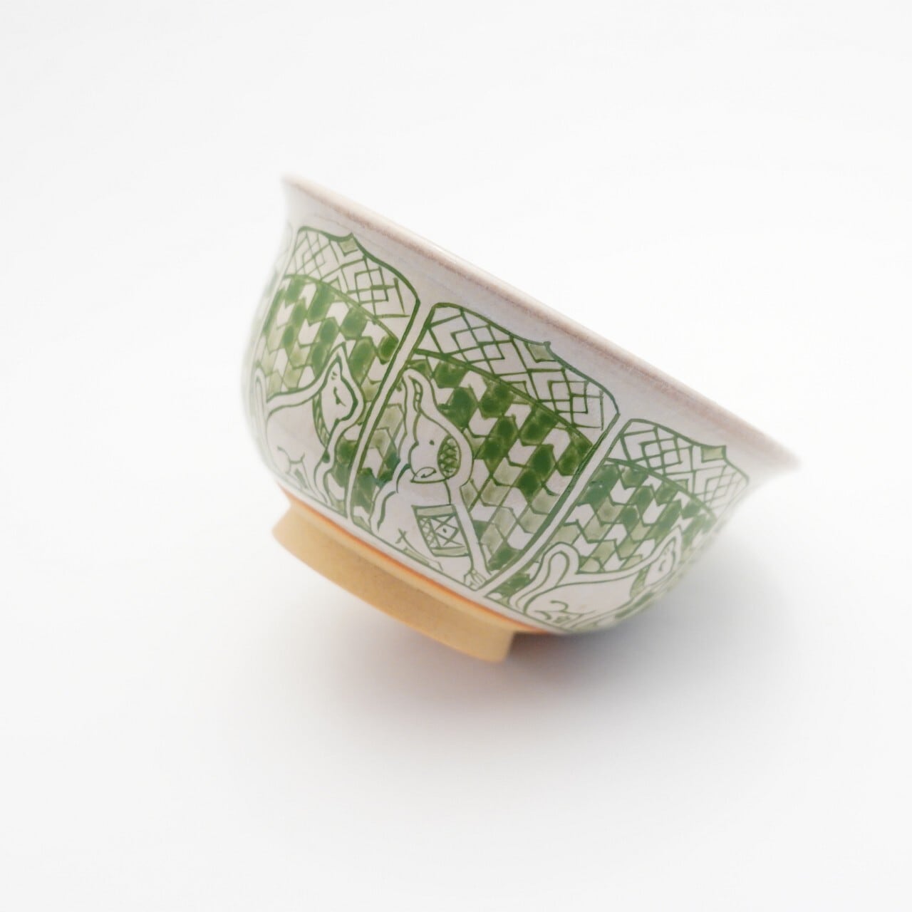 赤膚焼は古くは茶道具を中心に制作され、花や動物、人などが日本画のようなタッチで描かれているものがあり、多様に表現されていました。現在では日用雑器も多くつくられるようになり、奈良絵と呼ばれる簡略化されたデザインの絵が描かれています。過去から今に至るまで変化してきた赤膚焼の柔軟さを大切にし、新しい雰囲気も取り入れ、天平の風という赤膚焼正窯オリジナルの奈良絵デザインと大塩ほさな独自の世界観で表現するエキゾチックなデザインを軸に、変化を楽しみつつ「今」の私にしかつくれないものを表現しています