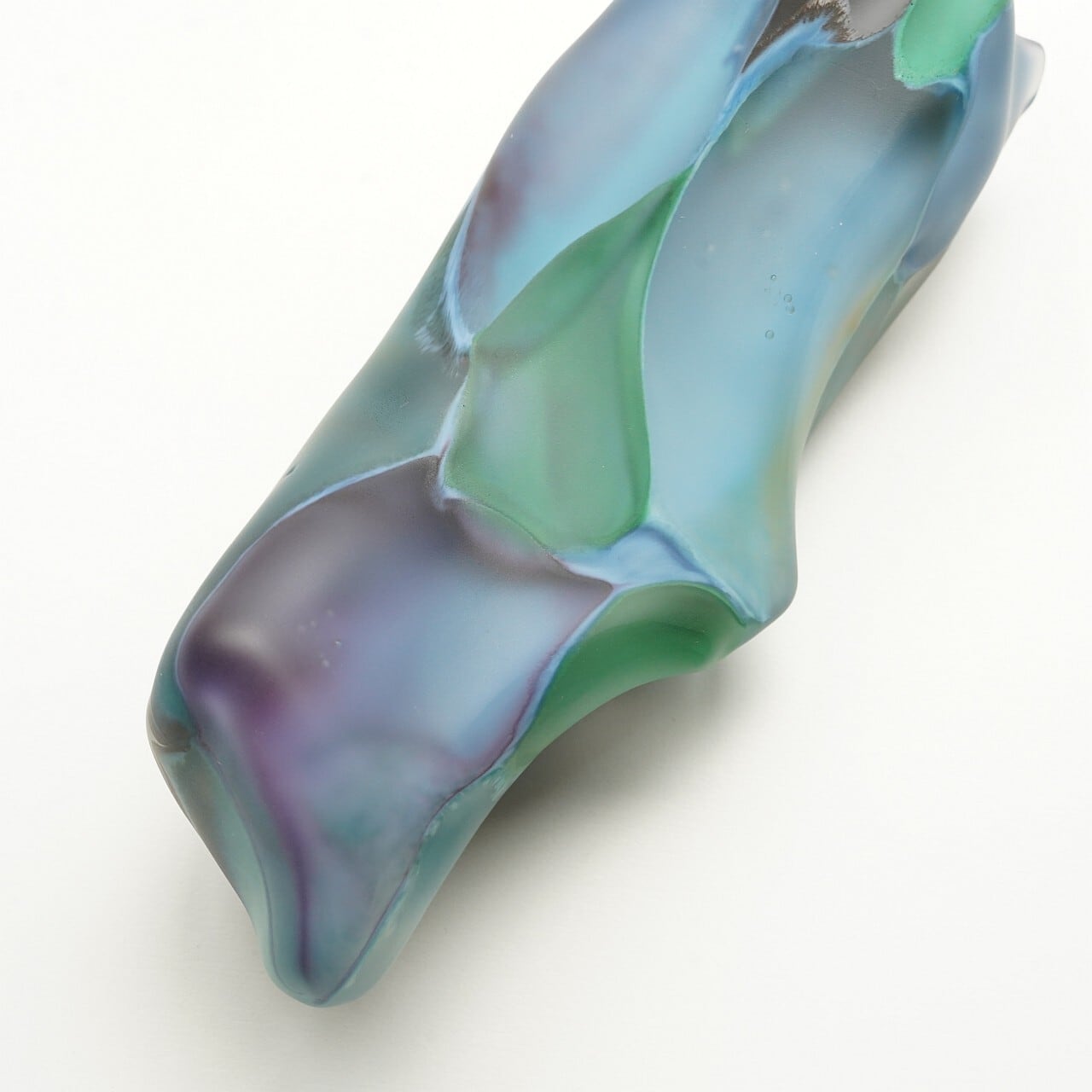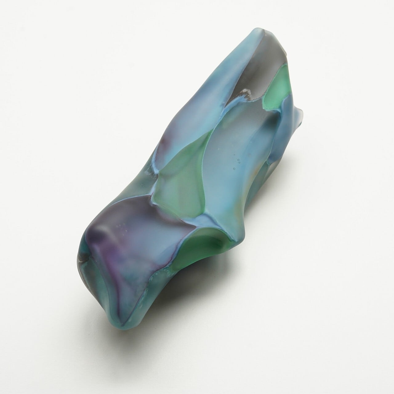パウダーガラスをつけたガラスの塊、複数個を一体化させた作品は光に当たると中の色が表出します。