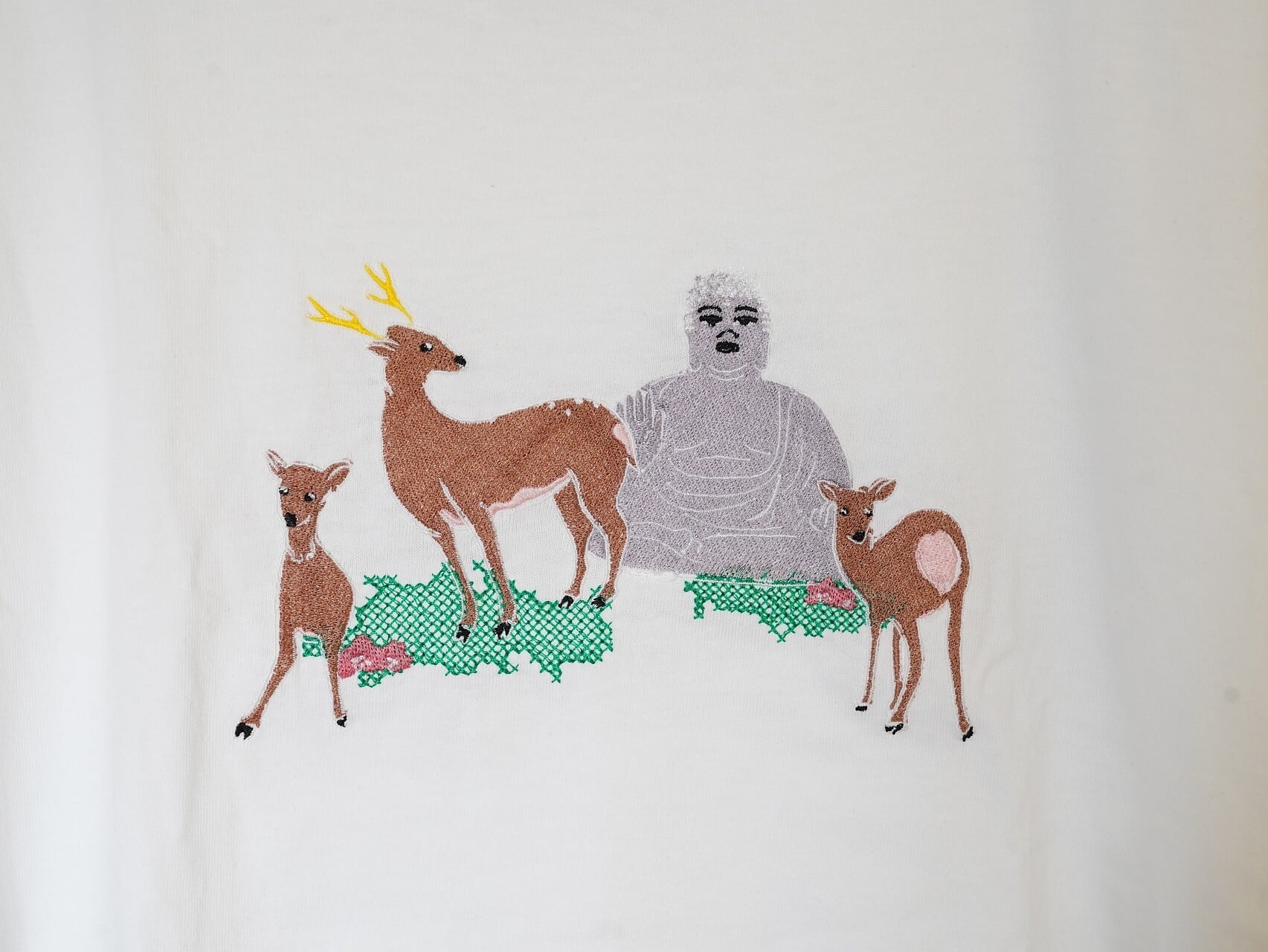 ◆Tシャツの草原の緑は刺繍のクロスステッチで表現し、小さなお花は奈良の県花の八重桜をイメージして制作して頂きました。